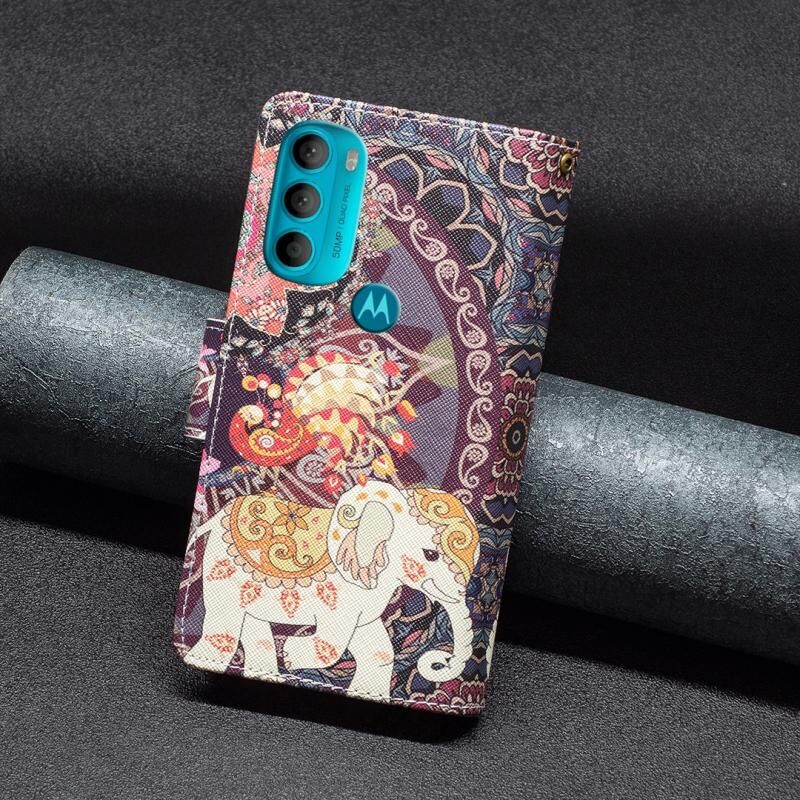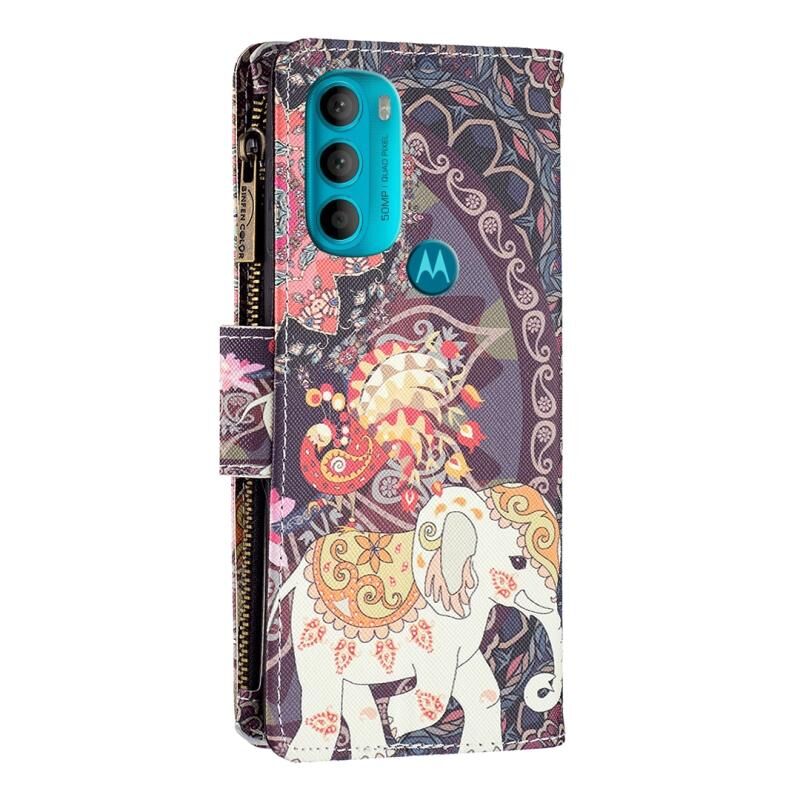 Θήκη τηλεφώνου δέρμα με οριζόντιο άνοιγμα και φερμουάρ, με έγχρωμα σχέδια (Λουλούδια και Ελέφαντες) για Motorola Moto G71 5G.