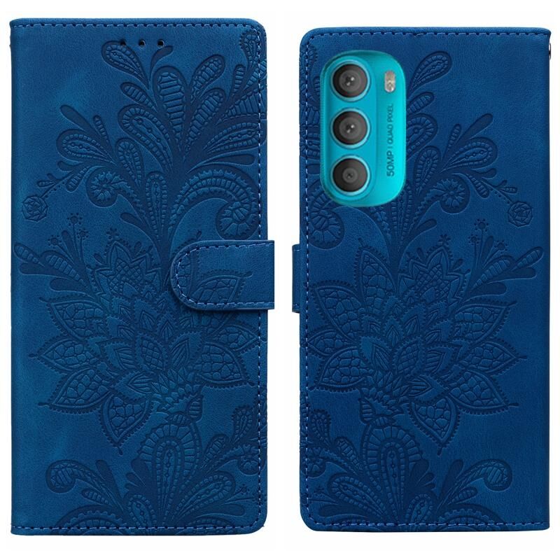 Θήκη κινητού τηλεφώνου Motorola Moto G71 5G από PU με δαντελένιο λουλουδάτο ανάγλυφο και μαγνητικό κούμπωμα, με λουρί καρπού (Πράσινο)