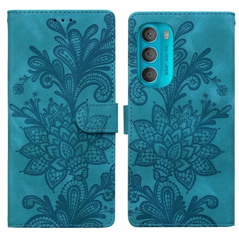 Θήκη κινητού τηλεφώνου Motorola Moto G71 5G από PU με δαντελένιο λουλουδάτο ανάγλυφο και μαγνητικό κούμπωμα, με λουρί καρπού (Πράσινο)