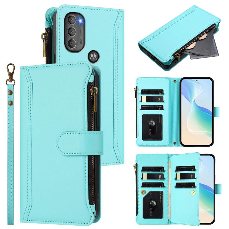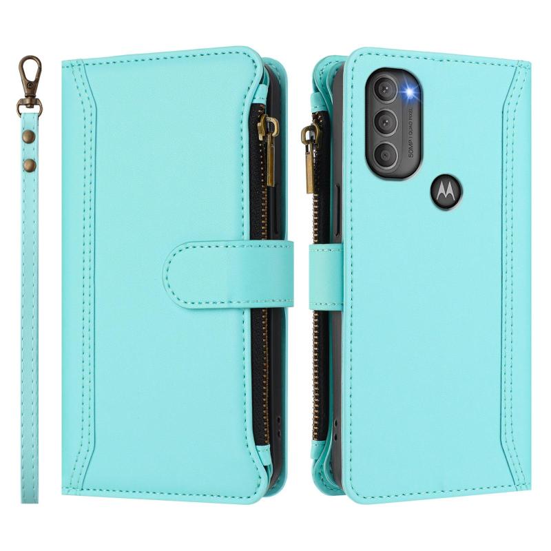 For Motorola Moto G71 5G Magnetic Closure 9 Card Slots Zipper Leather Case with Hand Strap(Mint Green)