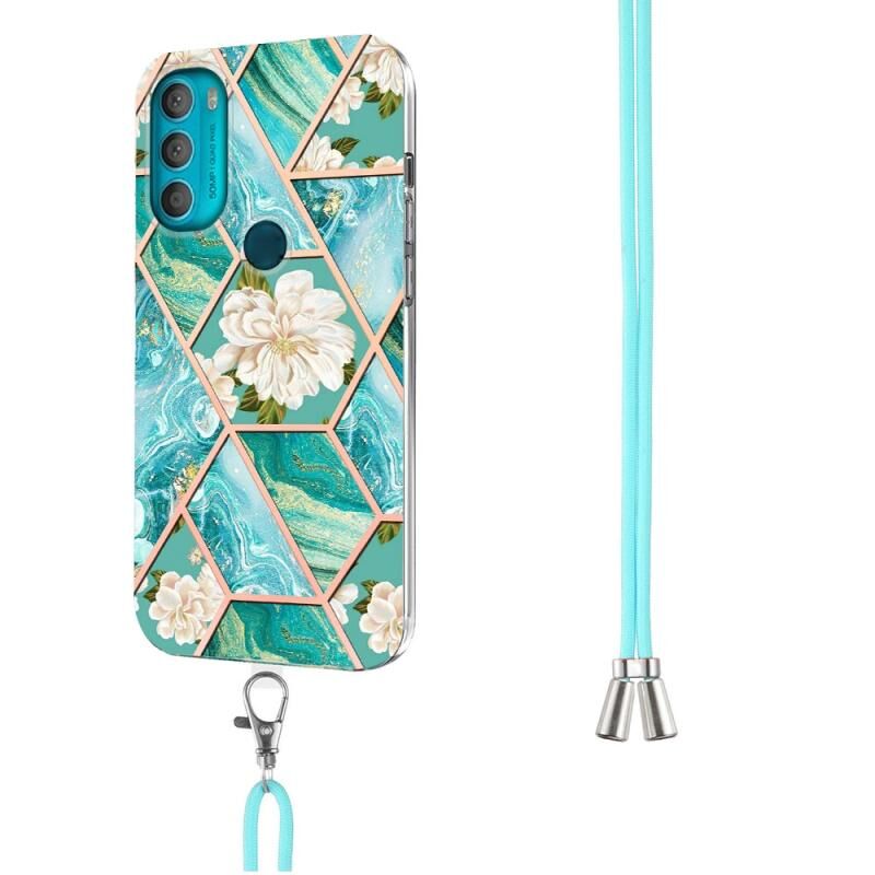 Θήκη τηλεφώνου TPU με σχέδιο μαρμάρου και λουλουδιών για Motorola Moto G71 5G με κορδόνι (Ροζ Λουλούδι)