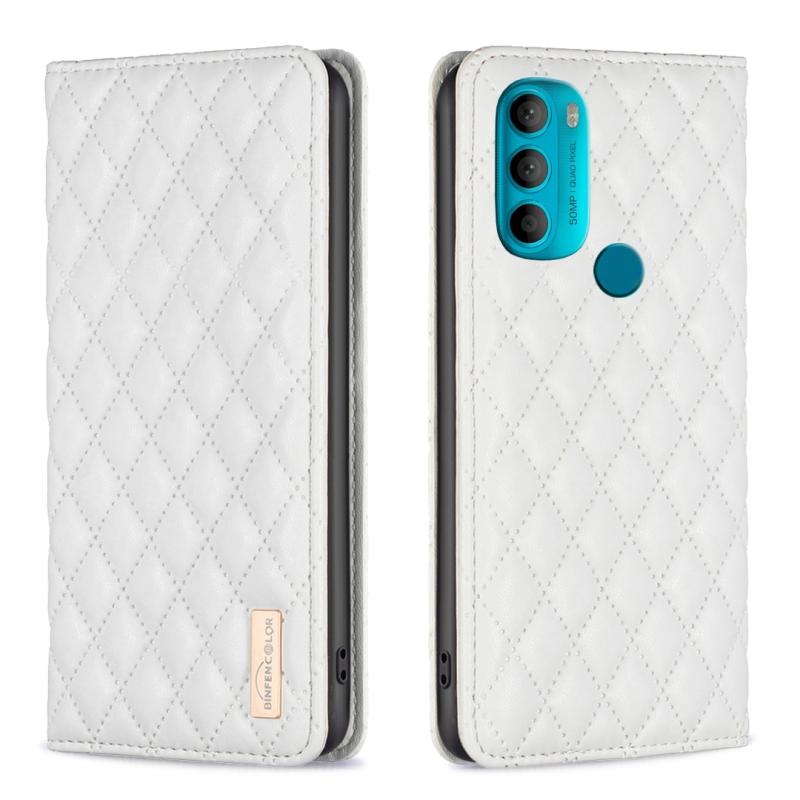 Θήκη κινητού τηλεφώνου με μαγνητικό δέρμα τύπου flip για Motorola Moto G71 Diamond Lattice (Λευκό)
