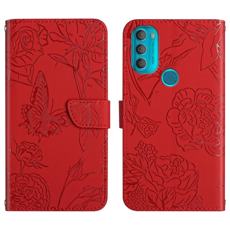 Θήκη κινητού τηλεφώνου από δέρμα με ανάγλυφο σχέδιο πεταλούδας και παιώνιας για Motorola Moto G71 (Κόκκινο)