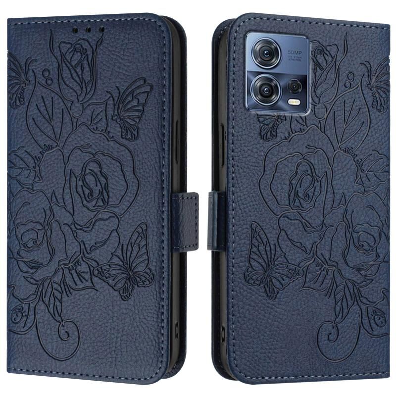 Για Motorola Moto G72 ανάγλυφο Rose RFID Anti-theft δερμάτινη θήκη τηλεφώνου (σκούρο μπλε)