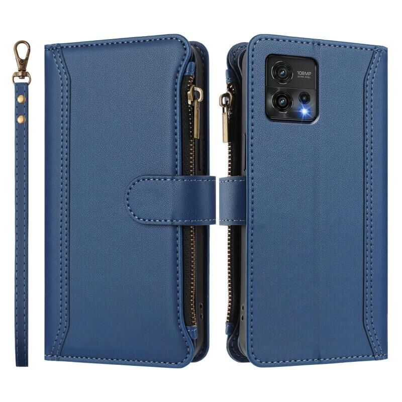 For Motorola Moto G72 Magnetic Closure 9 Card Slots Zipper Leather Case with Hand Strap(Dark Blue)