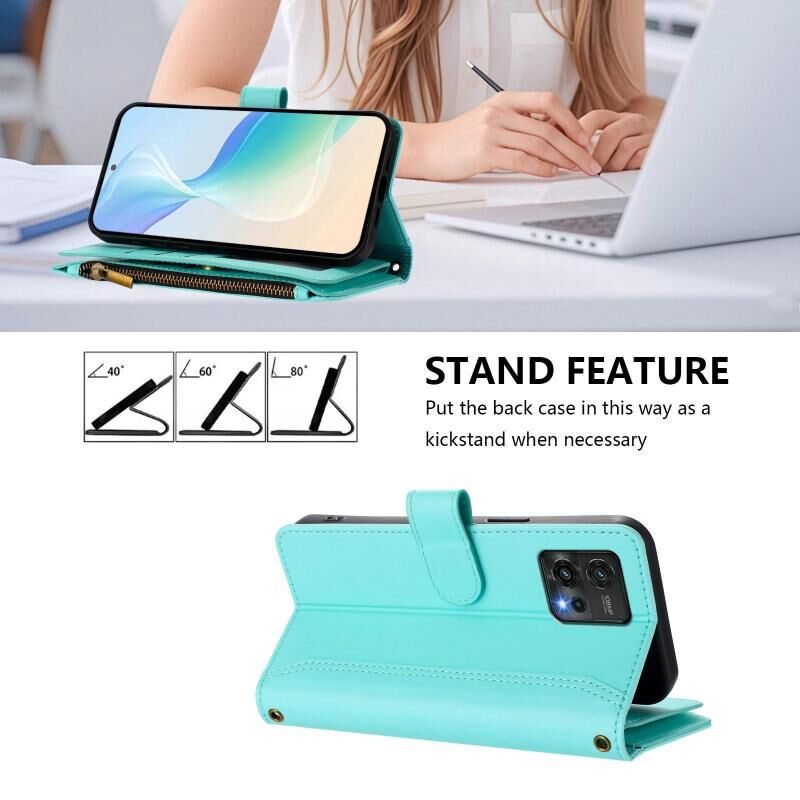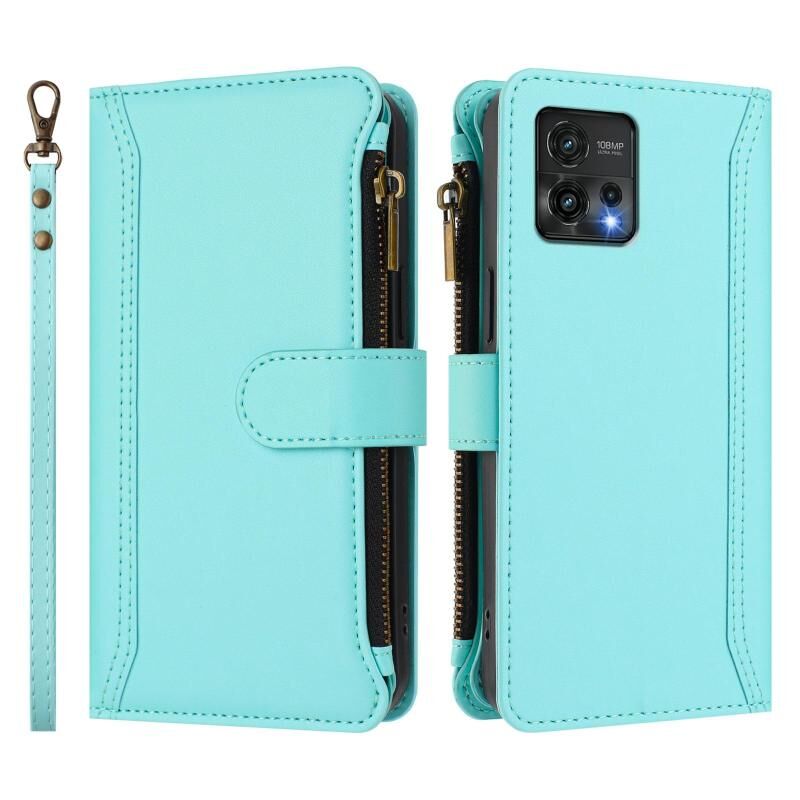 For Motorola Moto G72 Magnetic Closure 9 Card Slots Zipper Leather Case with Hand Strap(Mint Green)