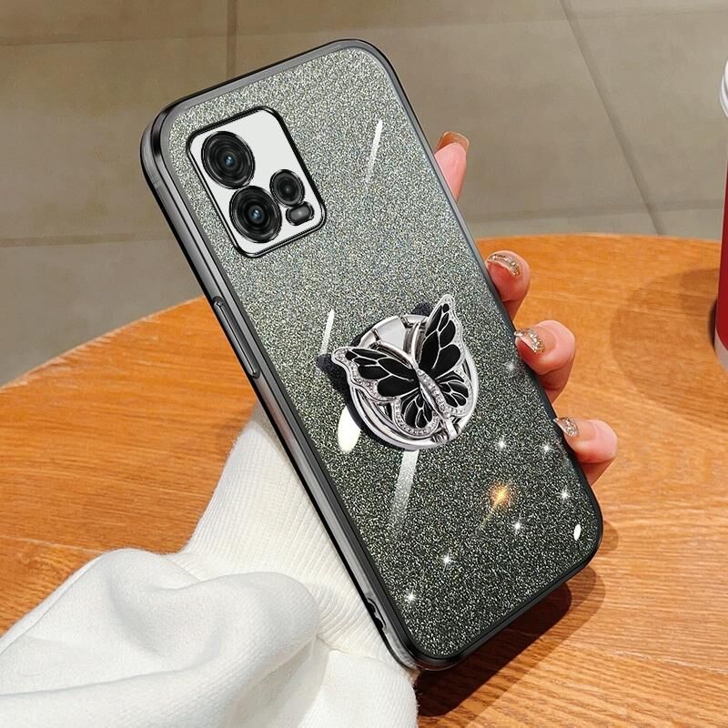 Για Motorola Moto G72 Επιμεταλλωμένο διαβάθμιση Glitter πεταλούδα κάτοχος TPU τηλέφωνο υπόθεση (μαύρο)
