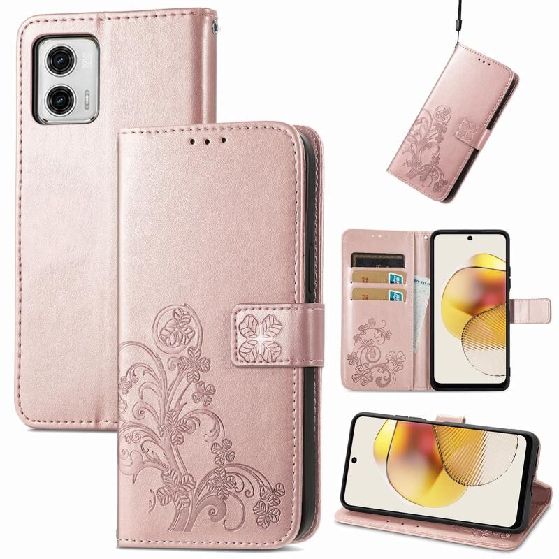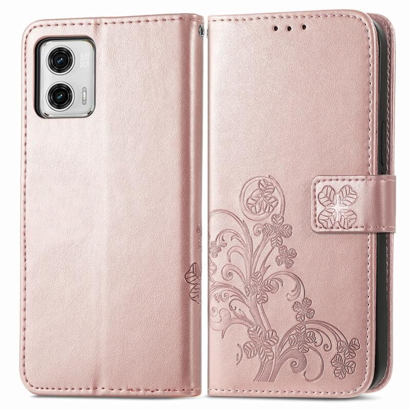 Θήκη τηλεφώνου δερμάτινη με ανάγλυφο κούμπωμα σε σχήμα τριφυλλιού για Motorola Moto G73 (Χρυσό ροζ)