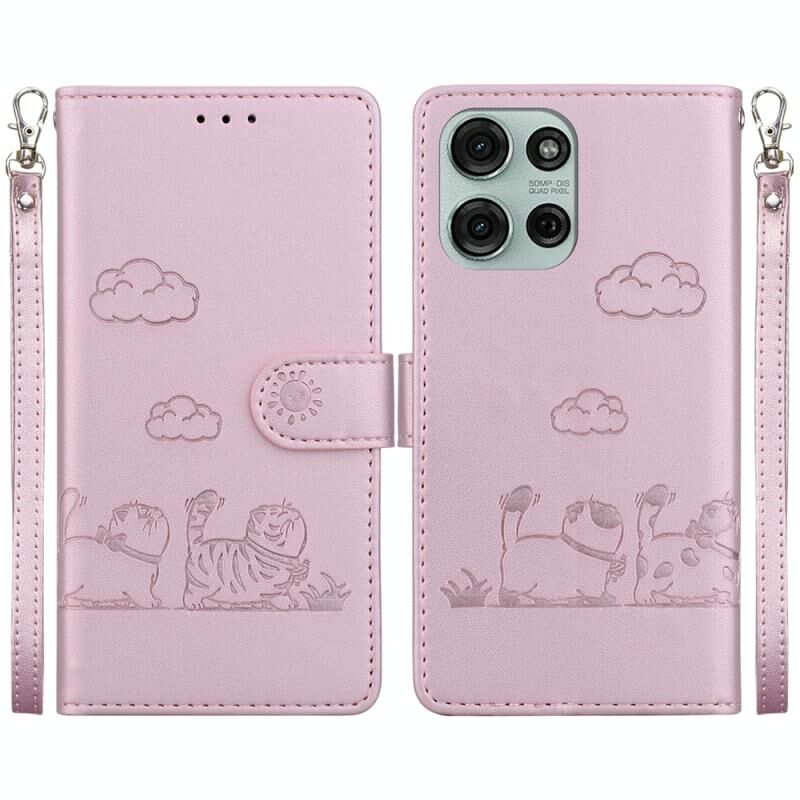 Θήκη τηλεφώνου από δέρμα με χαριτωμένες γάτες και τεχνολογία RFID για Motorola Moto G75 5G (Χρυσό Ρόδι)