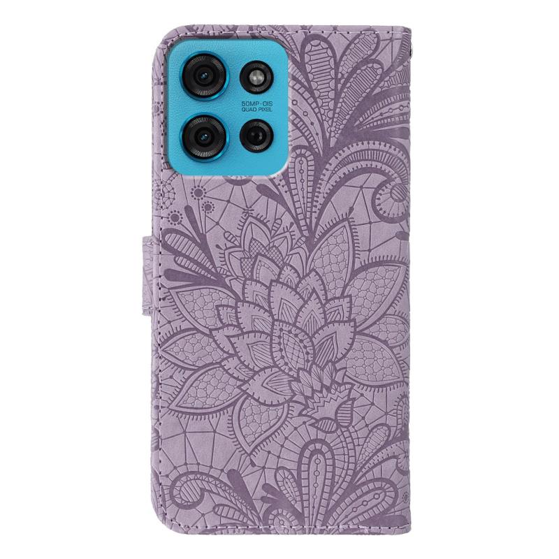 Θήκη τηλεφώνου από δέρμα με ανάγλυφο σχέδιο δαντέλας λουλουδιών για Motorola Moto G75 5G (Μωβ)