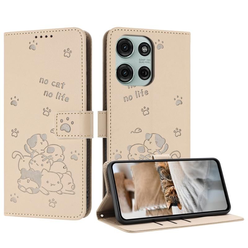 Θήκη δερμάτινη για Motorola Moto G75 με ανάγλυφο σχέδιο γατάκι και λουρί (Μπεζ)