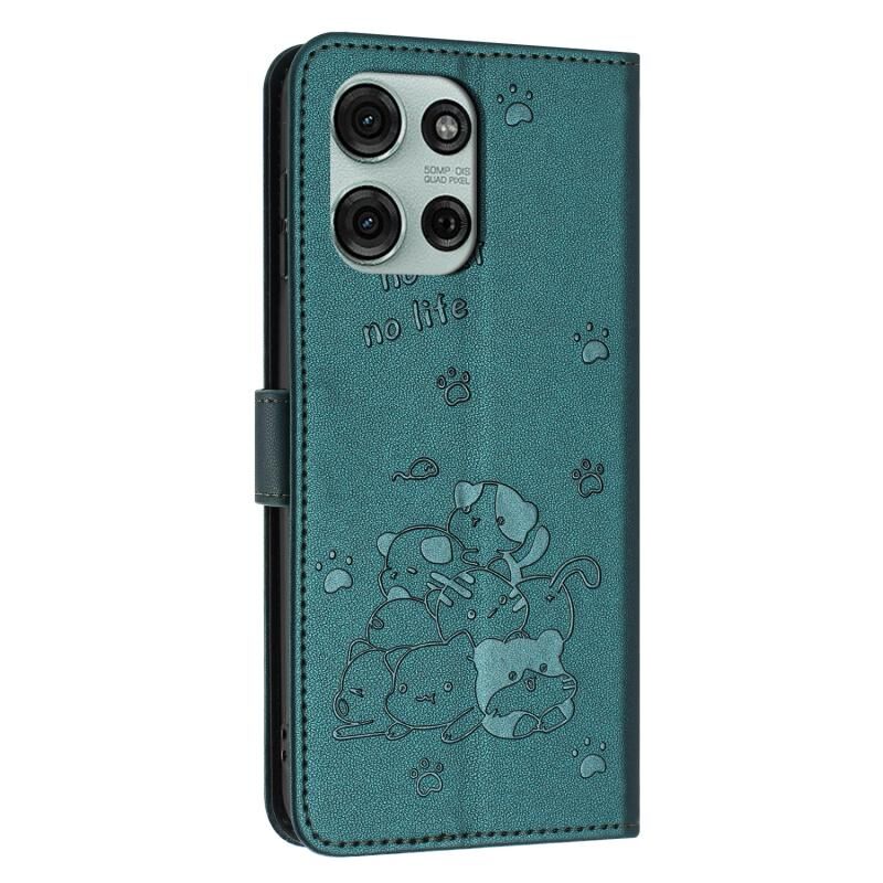 Θήκη δερμάτινη για Motorola Moto G75 με ανάγλυφο σχέδιο γατάκι και λουρί (Μπλε)
