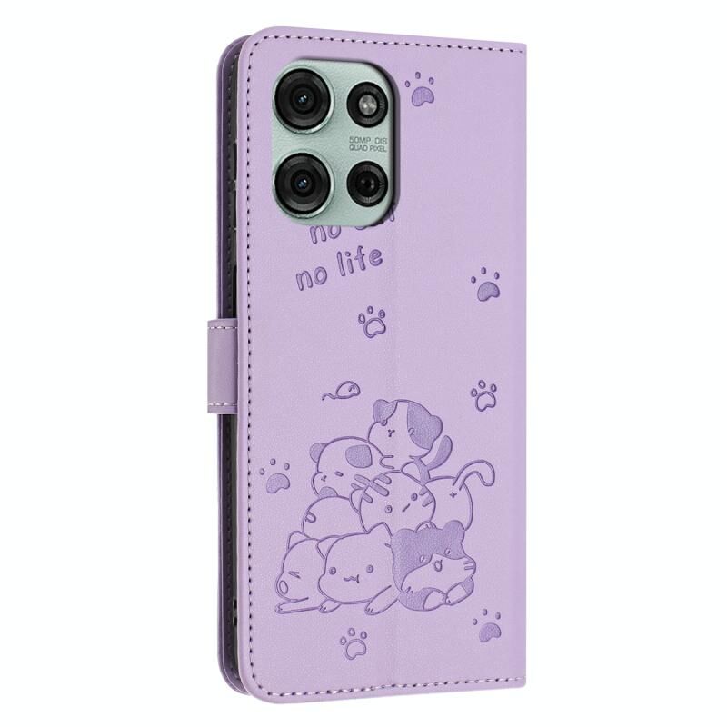 Θήκη δερμάτινη για Motorola Moto G75 με ανάγλυφο σχέδιο γατάκι και λουρί (Μωβ)