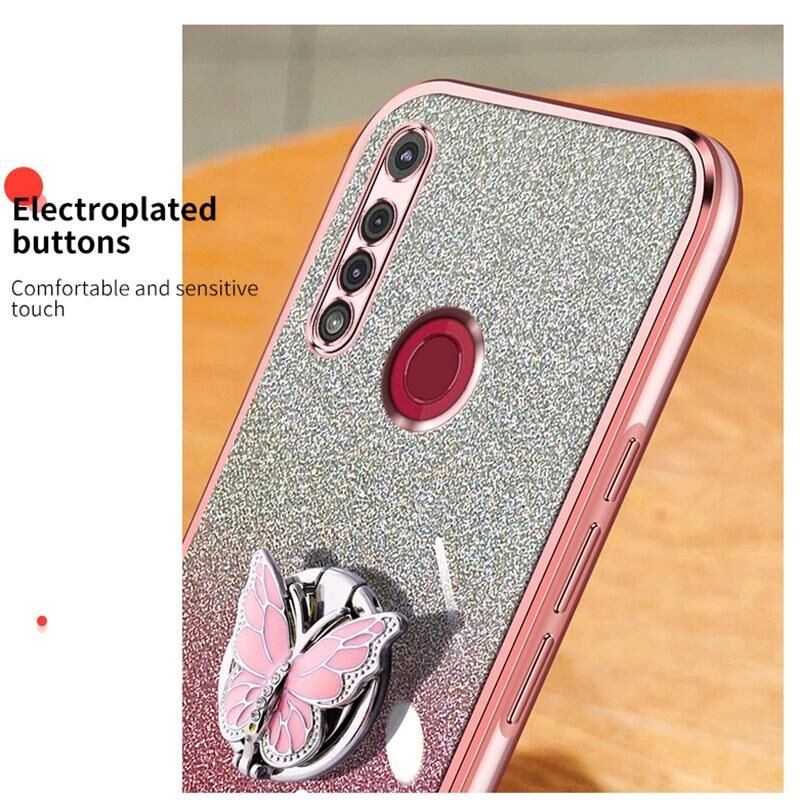 Για Motorola Moto G8 Play Επιμεταλλωμένο βαθμιδωτή Glitter πεταλούδα κάτοχος TPU υπόθεση τηλεφώνου (ροζ)