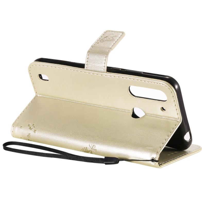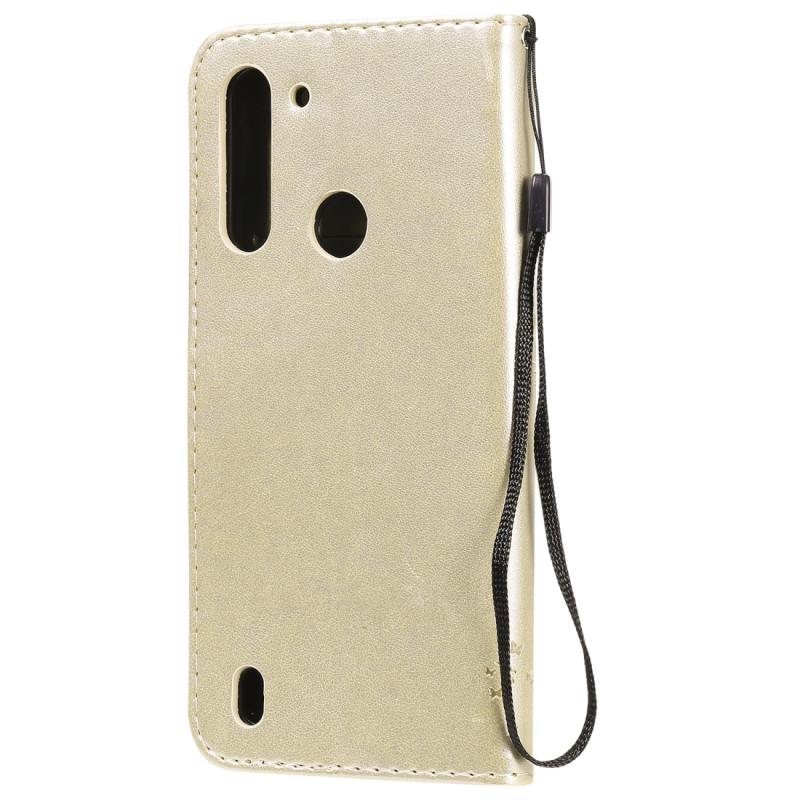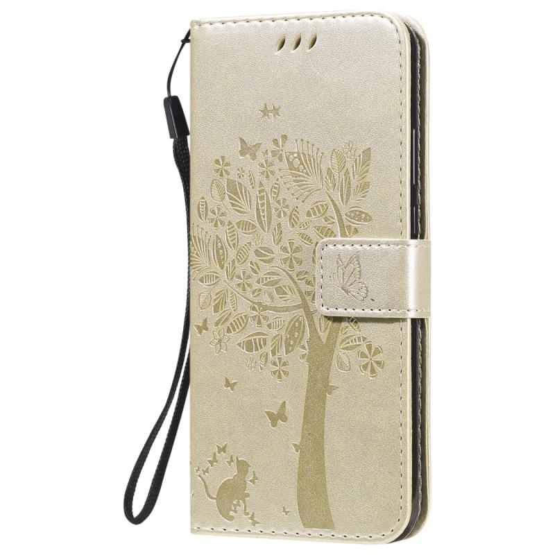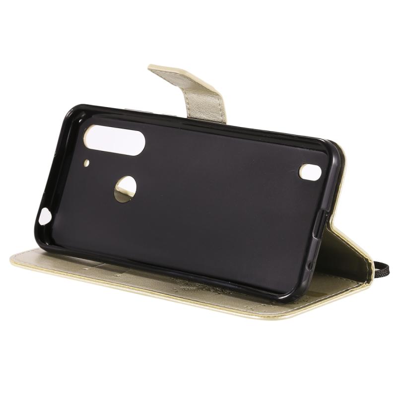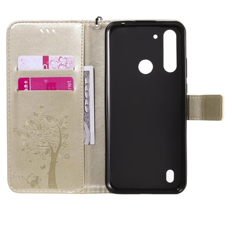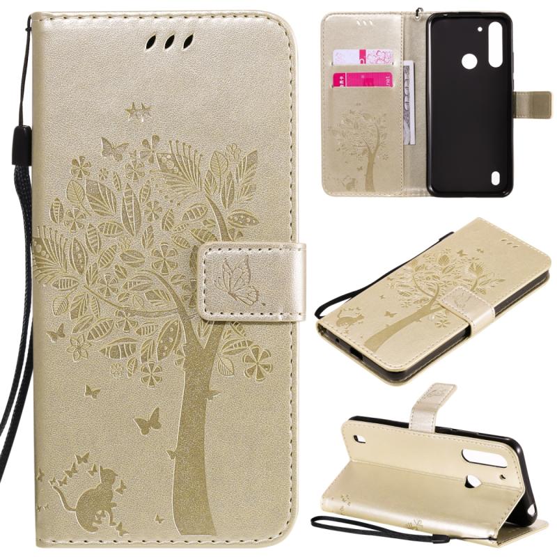 Θήκη δέρματος οριζόντιας αναδίπλωσης για Motorola Moto G8 Power Lite με ανάγλυφο σχέδιο δέντρου & γάτας, με βάση στήριξης & θήκες καρτών & πορτοφόλι & κορδόνι (Χρυσός)