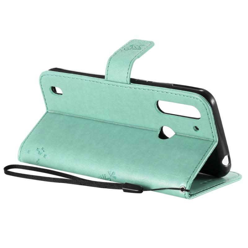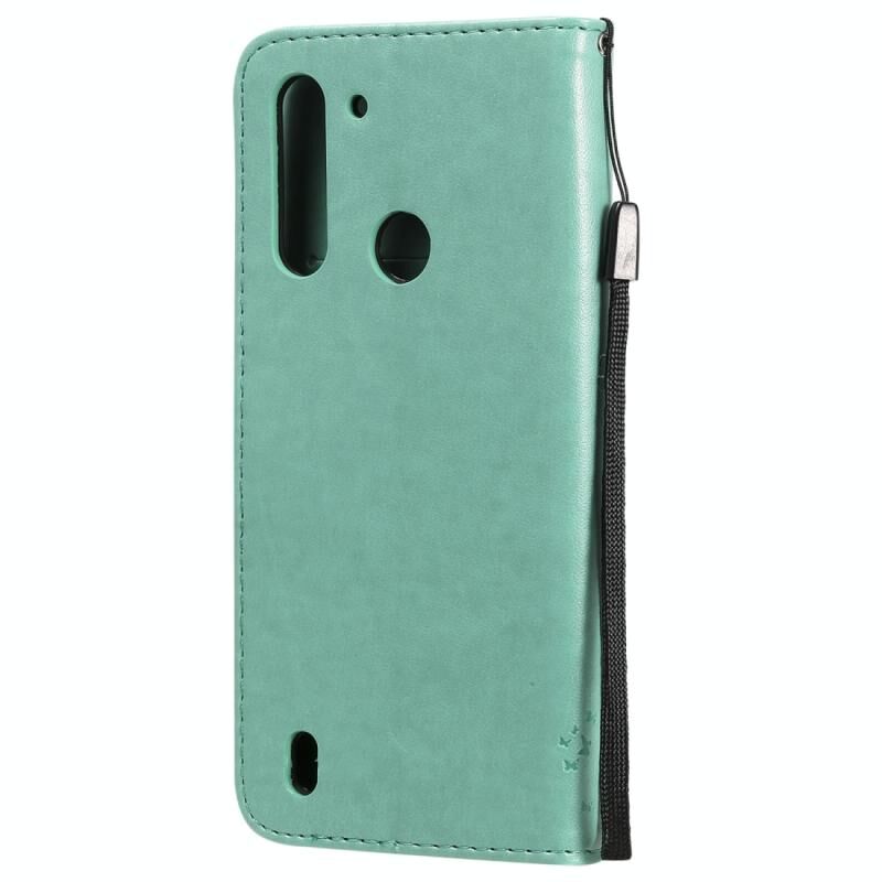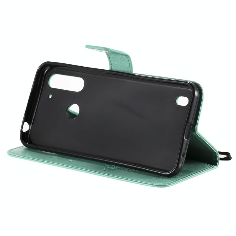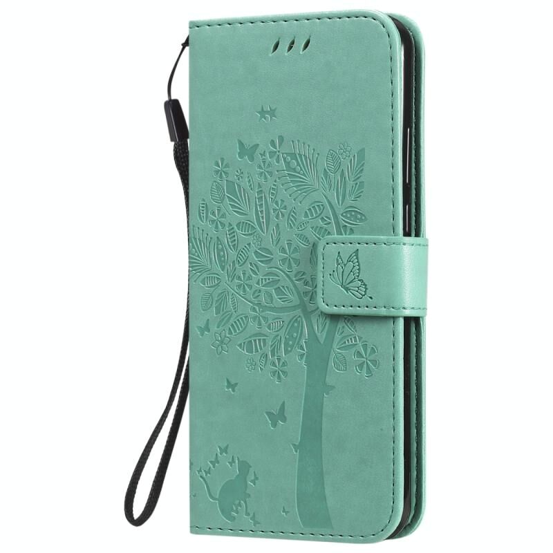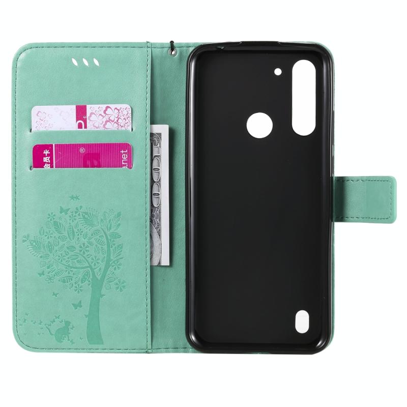 Θήκη δέρματος οριζόντιας αναδίπλωσης για Motorola Moto G8 Power Lite με ανάγλυφο σχέδιο δέντρου & γάτας, με βάση στήριξης & θήκες καρτών & πορτοφόλι & κορδόνι (πράσινο)