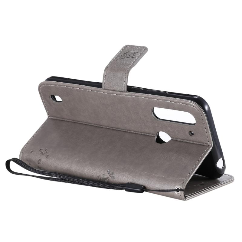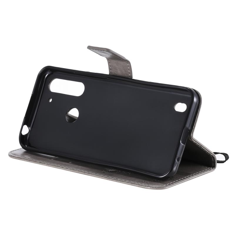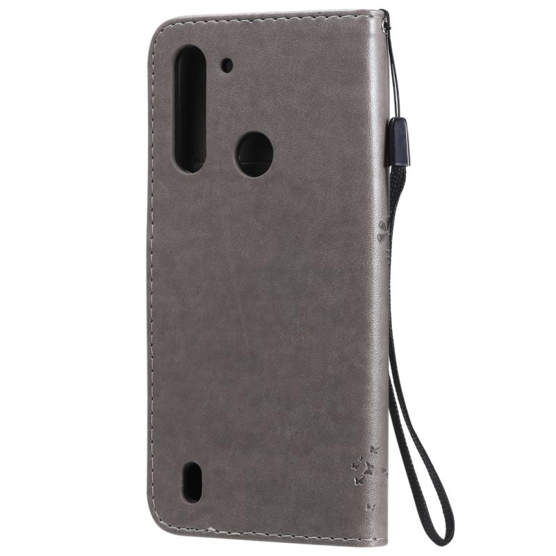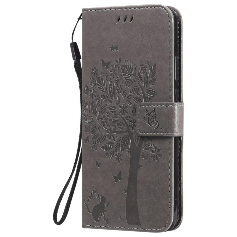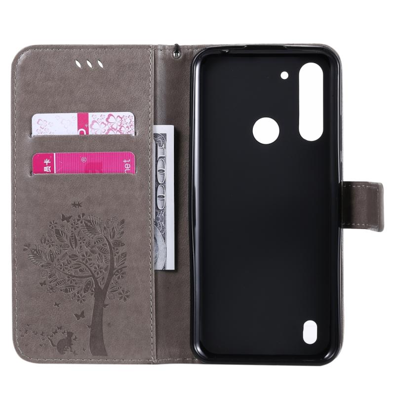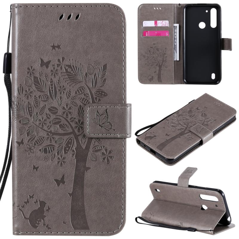 Θήκη δέρματος οριζόντιας αναδίπλωσης για Motorola Moto G8 Power Lite με ανάγλυφο σχέδιο δέντρου & γάτας, με βάση στήριξης & θήκες καρτών & πορτοφόλι & κορδόνι (Γκρι)
