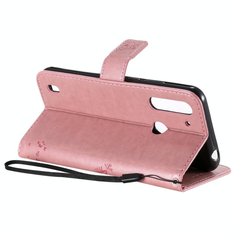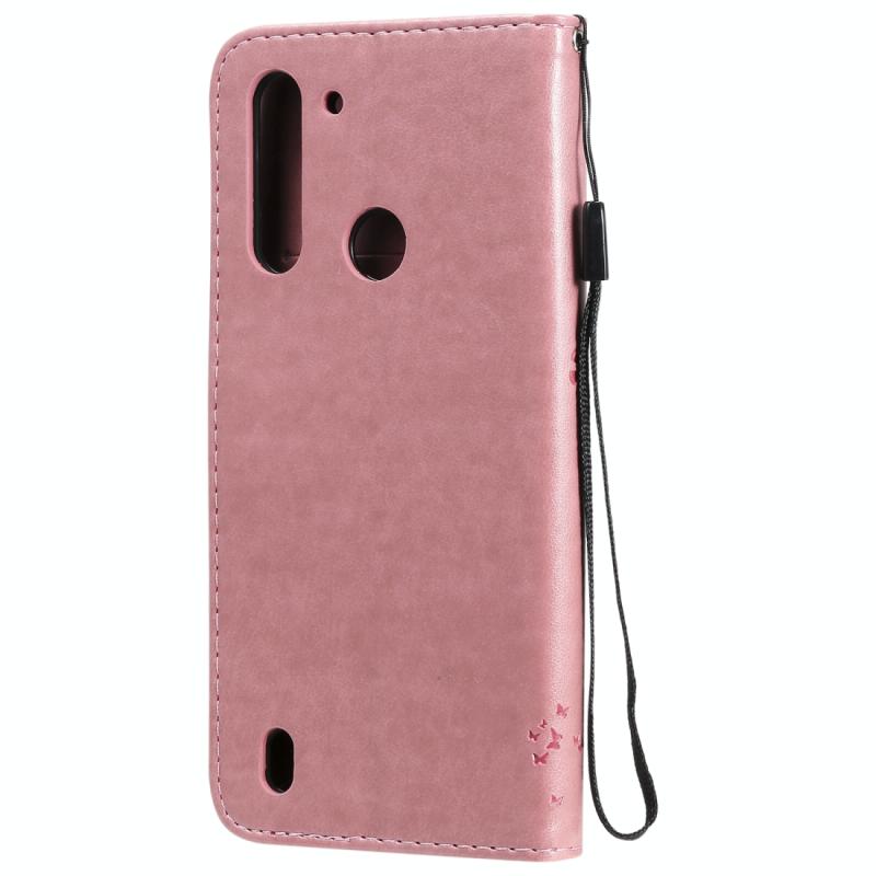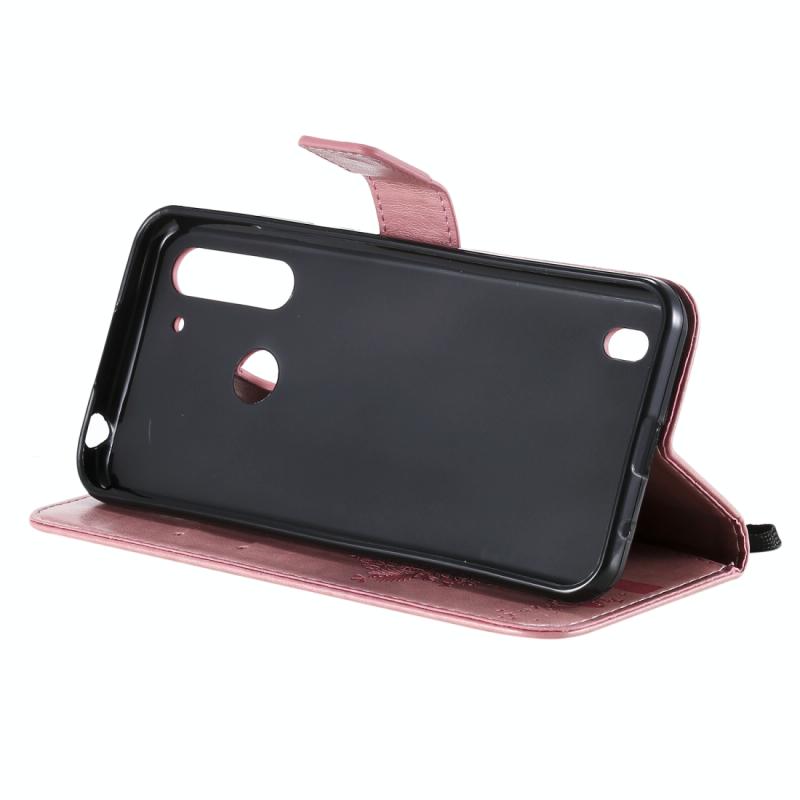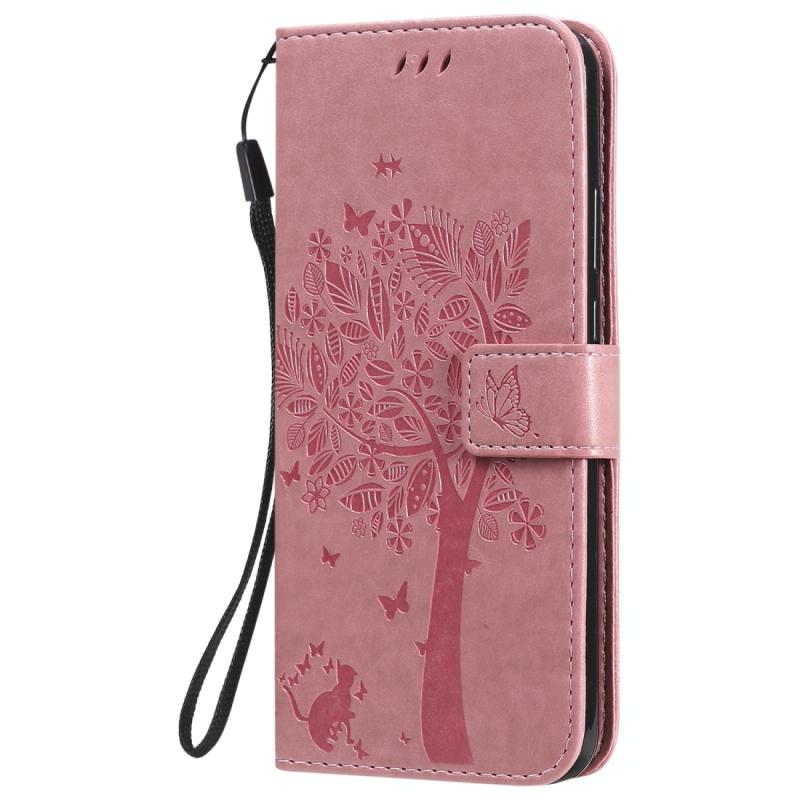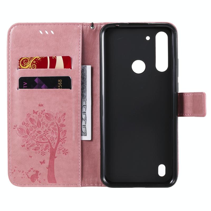 Θήκη δέρματος οριζόντιας αναδίπλωσης για Motorola Moto G8 Power Lite με ανάγλυφο σχέδιο δέντρου & γάτας, με βάση στήριξης & θήκες καρτών & πορτοφόλι & κορδόνι (ρόζ)