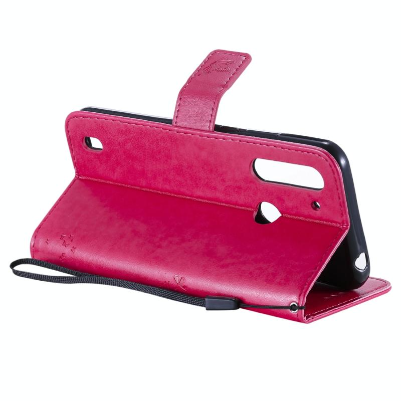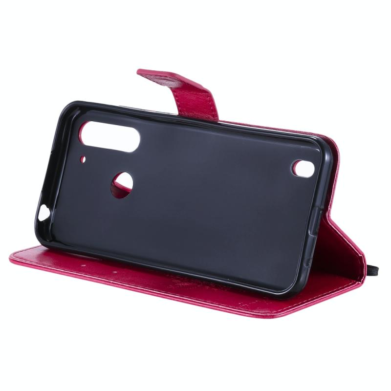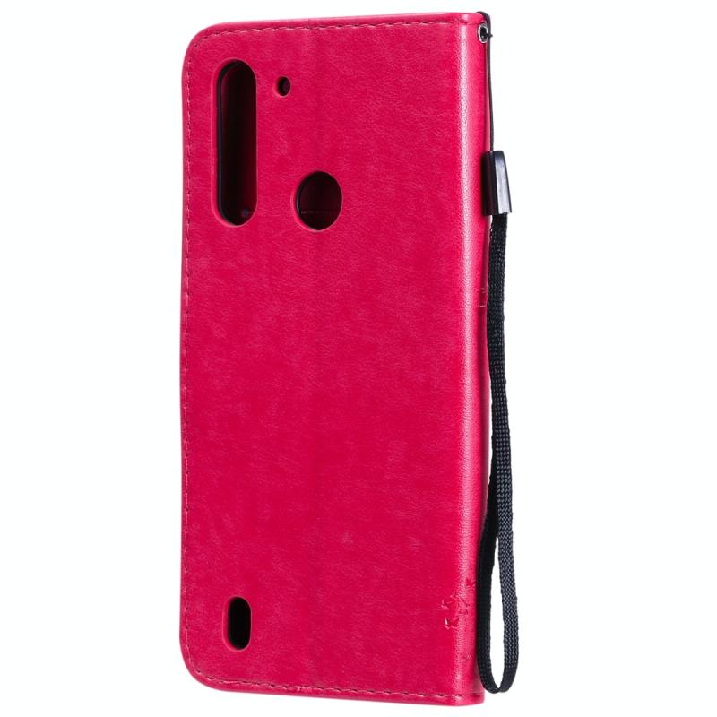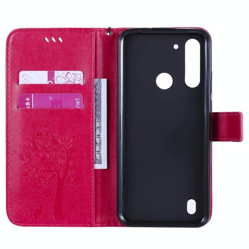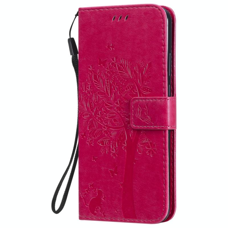 Θήκη δέρματος οριζόντιας αναδίπλωσης για Motorola Moto G8 Power Lite με ανάγλυφο σχέδιο δέντρου & γάτας, με βάση στήριξης & θήκες καρτών & πορτοφόλι & κορδόνι (Ροζέ κόκκινο)