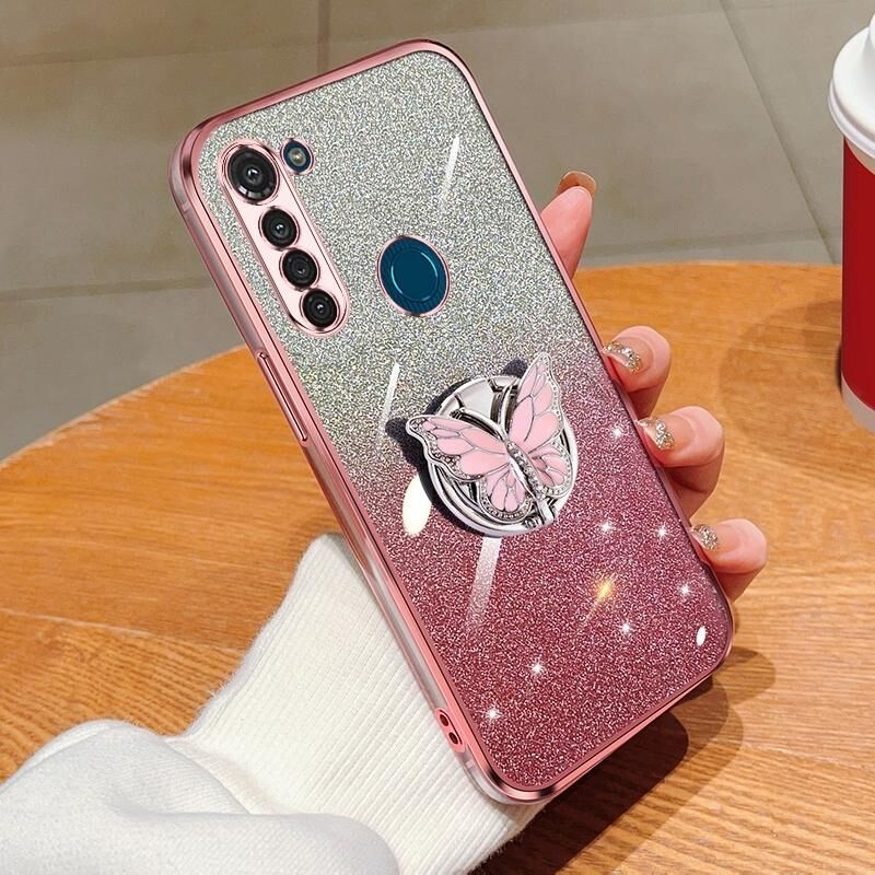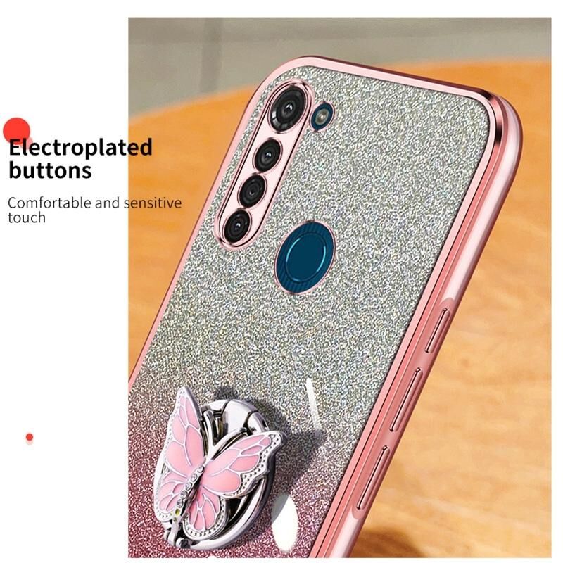Για Motorola Moto G8 Power Plated βαθμιδωτή Glitter πεταλούδα κάτοχος TPU τηλέφωνο υπόθεση (ροζ)