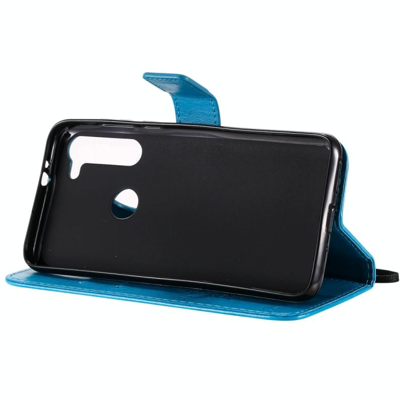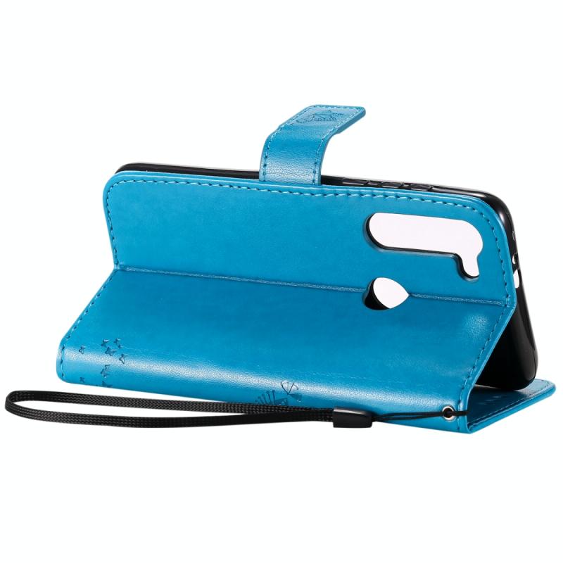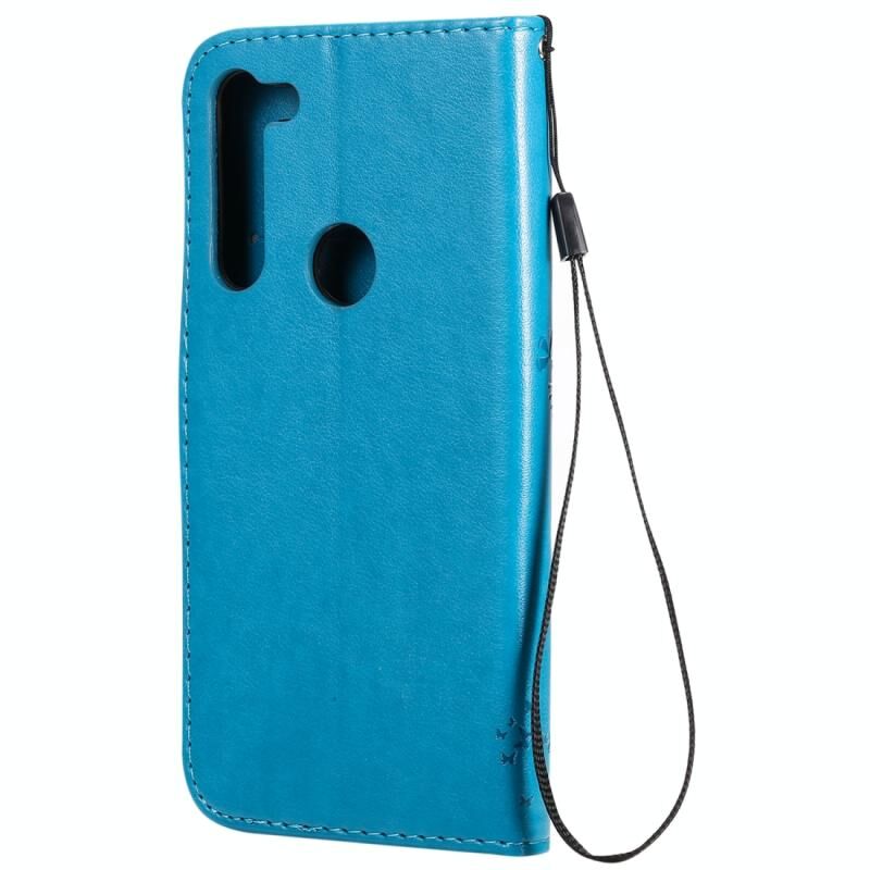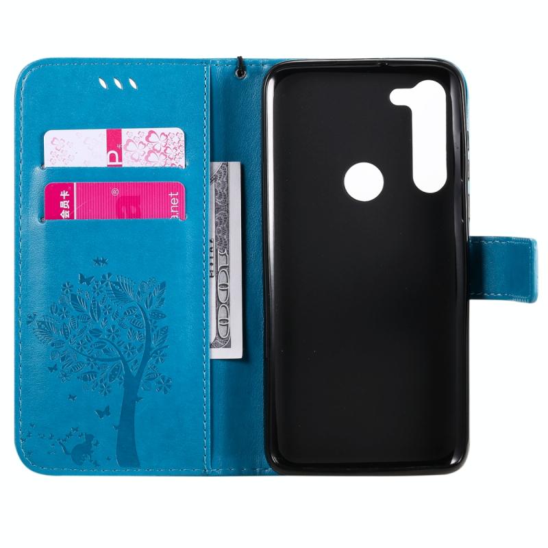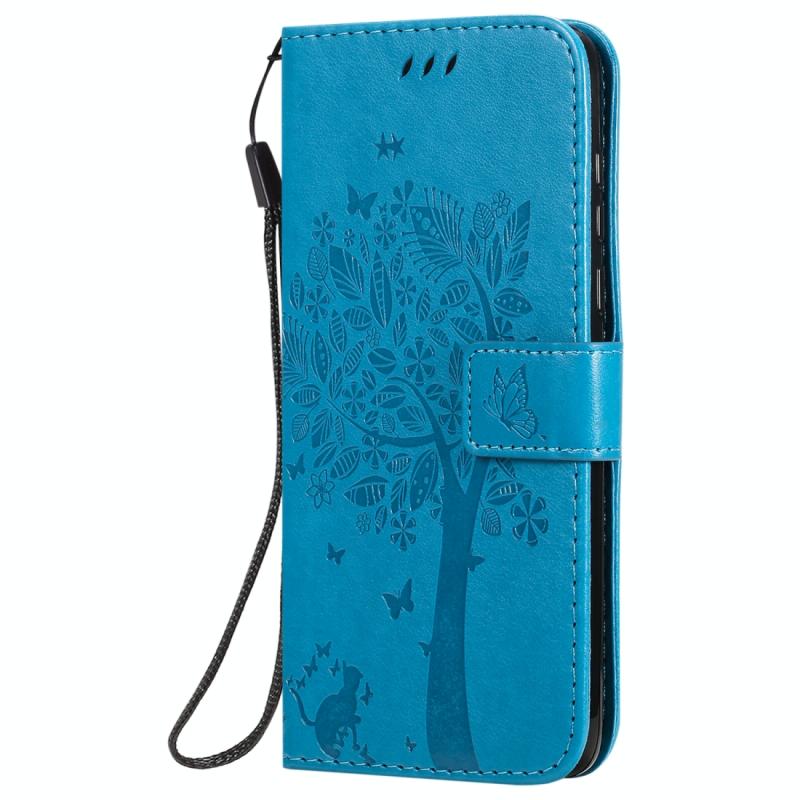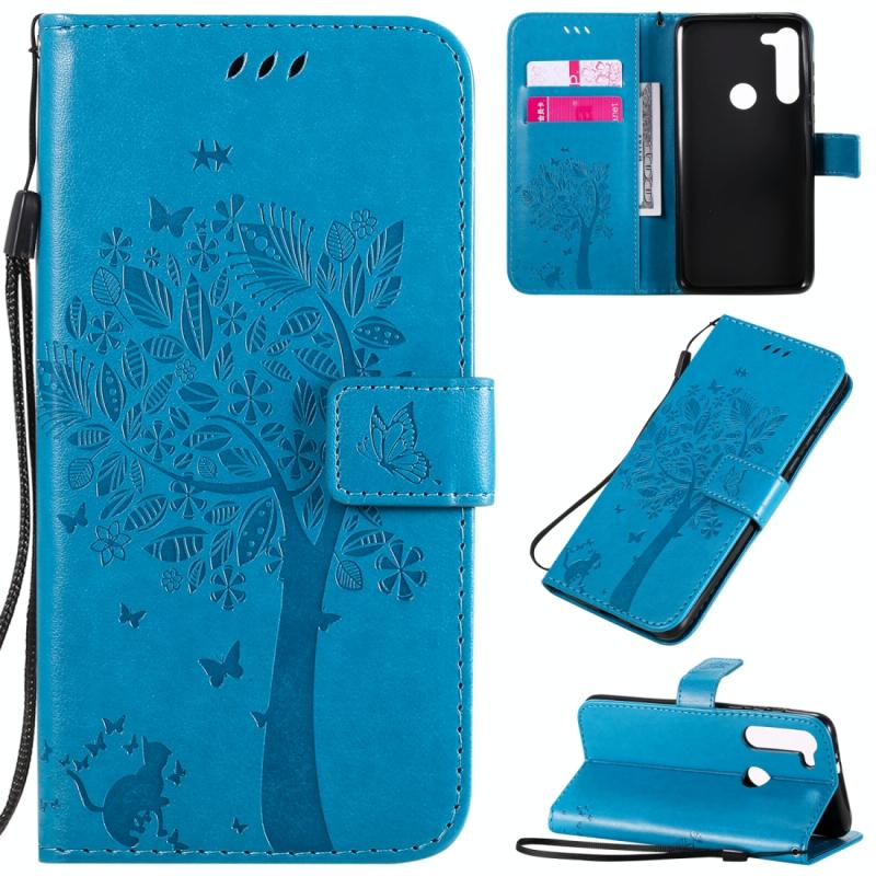 Θήκη δέρματος οριζόντιας αναδίπλωσης για Motorola Moto G8 Power με ανάγλυφο σχέδιο Δέντρου & Γάτας, με βάση στήριξης & θήκες καρτών & πορτοφόλι & κορδόνι (Μπλε)