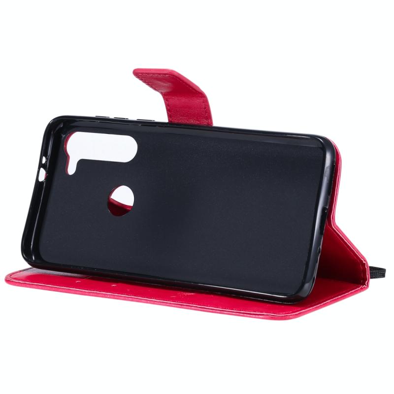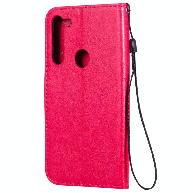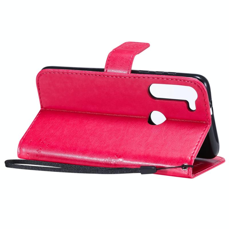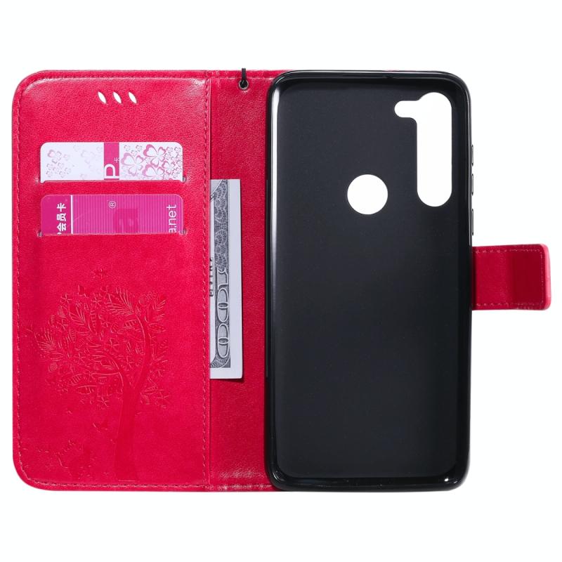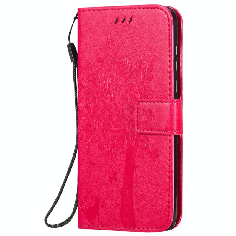 Θήκη δέρματος οριζόντιας αναδίπλωσης για Motorola Moto G8 Power με ανάγλυφο σχέδιο Δέντρου & Γάτας, με βάση στήριξης & θήκες καρτών & πορτοφόλι & κορδόνι (Ροζέ κόκκινο)