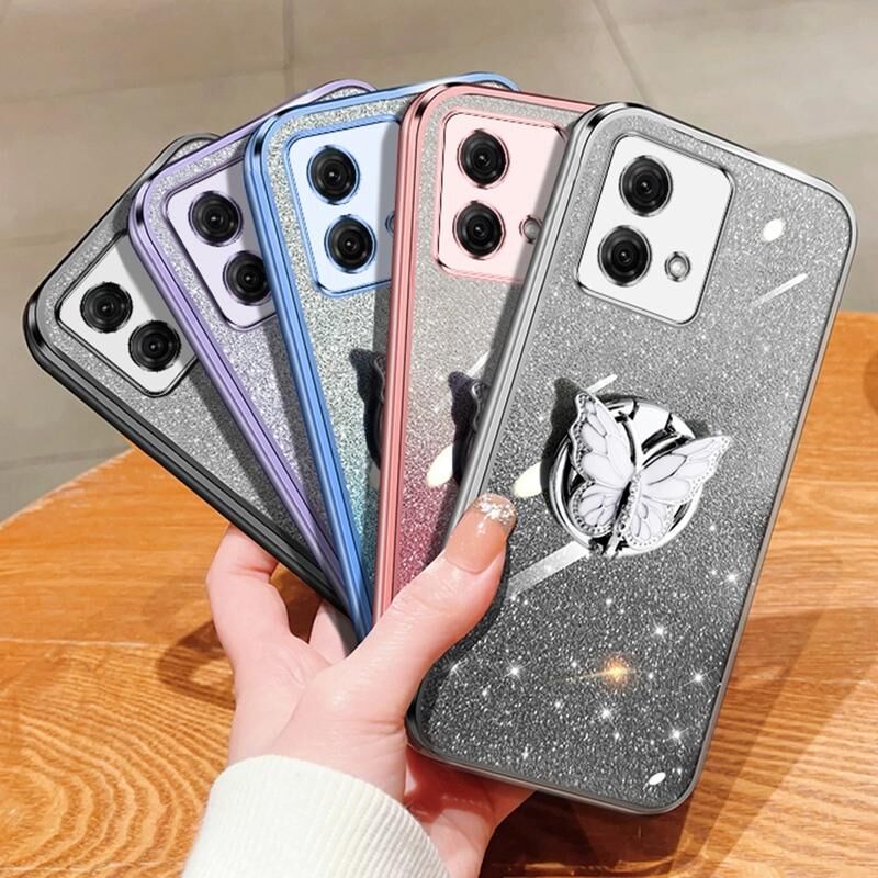 Για Motorola Moto G84 Επιμεταλλωμένο διαβάθμιση Glitter πεταλούδα κάτοχος TPU τηλέφωνο υπόθεση (ροζ)