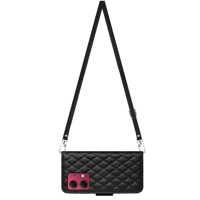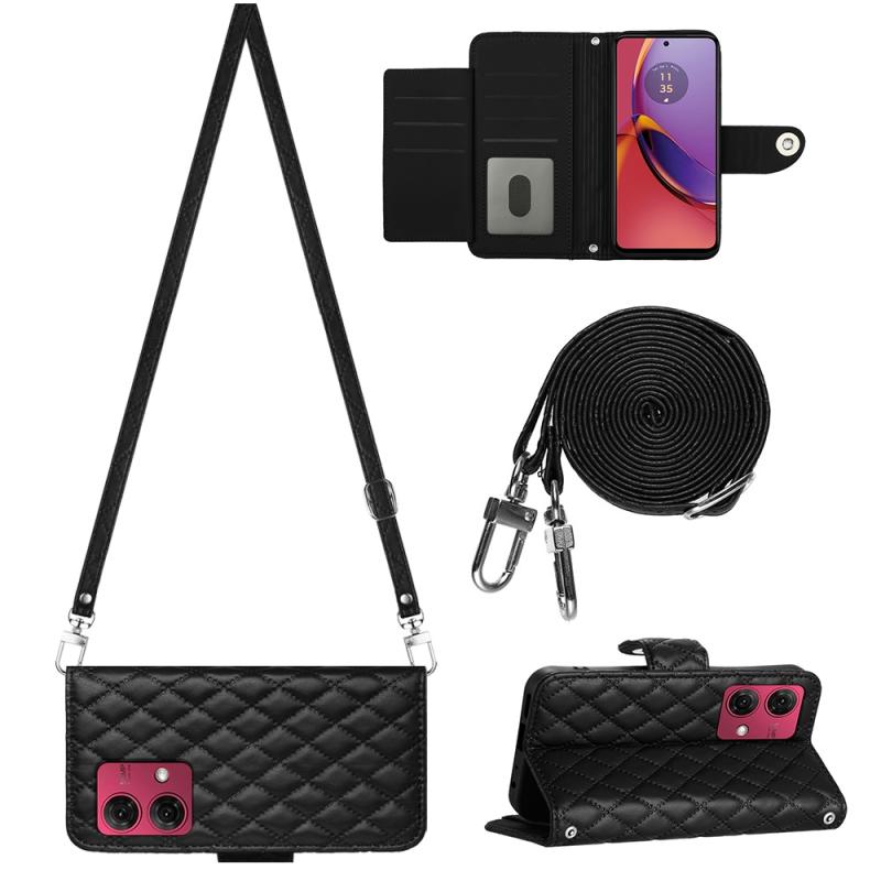 For Motorola Moto G84 Rhombic Texture Flip Leather Phone Case with Long Lanyard(Black)