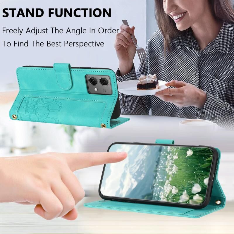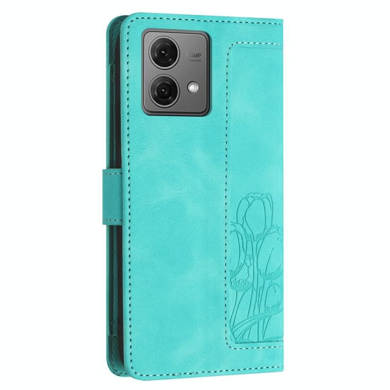 Θήκη κινητού τηλεφώνου από δέρμα με ανάγλυφα τουλίπες για Motorola Moto G84 με κορδόνι (Πράσινο)