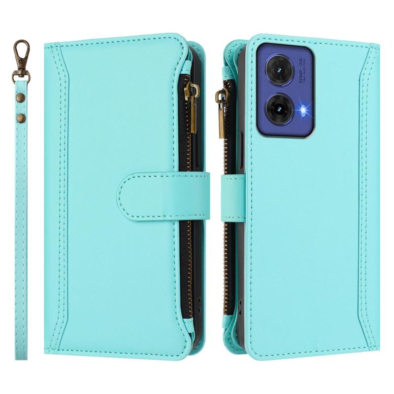 For Motorola Moto G85 5G Magnetic Closure 9 Card Slots Zipper Leather Case with Hand Strap(Mint Green)