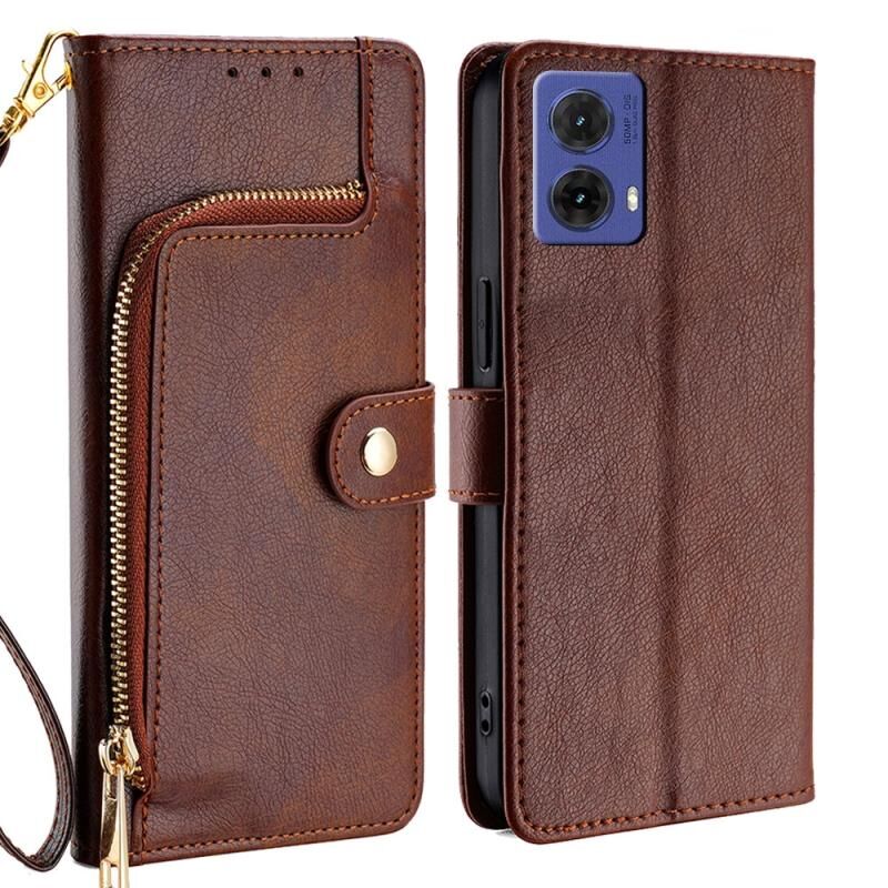 Για Motorola Moto G85 5G φερμουάρ τσάντα δερμάτινη θήκη τηλεφώνου (καφέ)