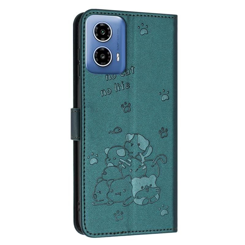 Θήκη δερμάτινη για Motorola Moto G85 με ανάγλυφο σχέδιο γατάκι και λουρί (Μωβ)