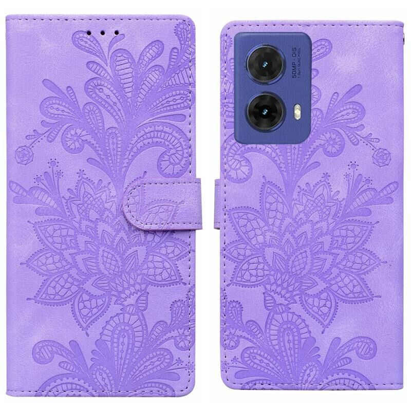 Θήκη κινητού τηλεφώνου Motorola Moto G85 με δαντελένιο λουλουδάτο ανάγλυφο, μαγνητικό κούμπωμα και λουρί καρπού (Πράσινο)