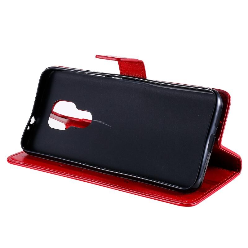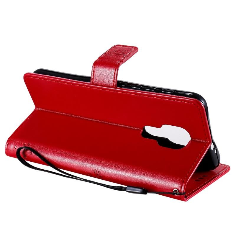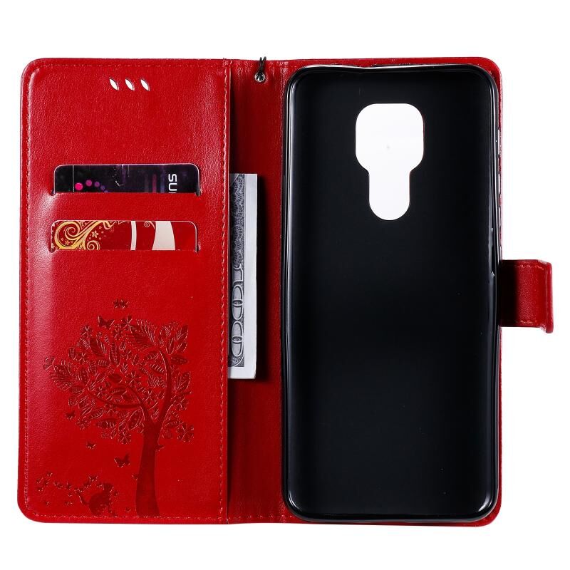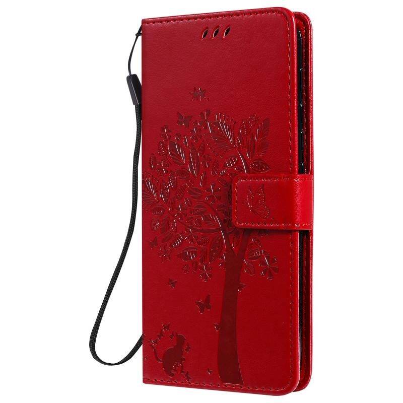 Θήκη για Motorola Moto G9 Play με σχέδιο Δέντρου & Γάτας, εκτυπωμένη με θερμοτύπηση, οριζόντια, από δερματίνη PU με βάση στήριξης & θήκες για κάρτες & πορτοφόλι & κορδόνι (Κόκκινο)