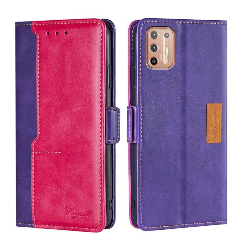Για Motorola Moto G9 Plus αντίθεση χρώμα πλευρά πόρπη δερμάτινη θήκη τηλεφώνου (Μωβ + Ροζένιο Κόκκινο)