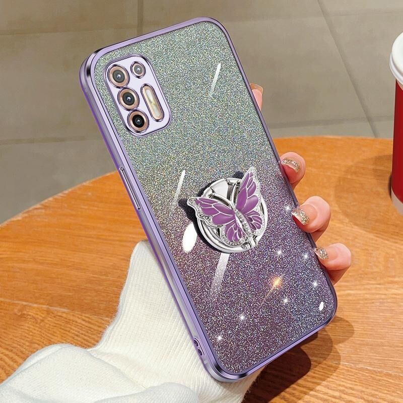 Για το Motorola Moto G9 Plus Επιμεταλλωμένο διαβάθμιση Glitter πεταλούδα κάτοχος TPU υπόθεση τηλεφώνου (μωβ)