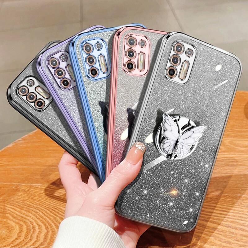 Για το Motorola Moto G9 Plus Επιμεταλλωμένο διαβάθμιση Glitter πεταλούδα κάτοχος TPU υπόθεση τηλεφώνου (ασημί)