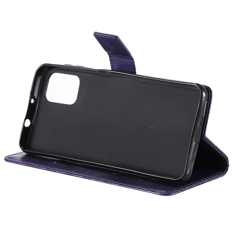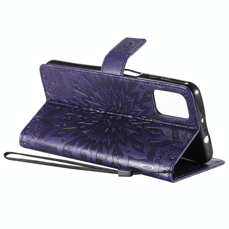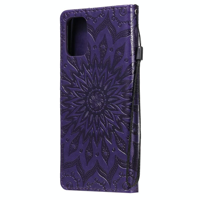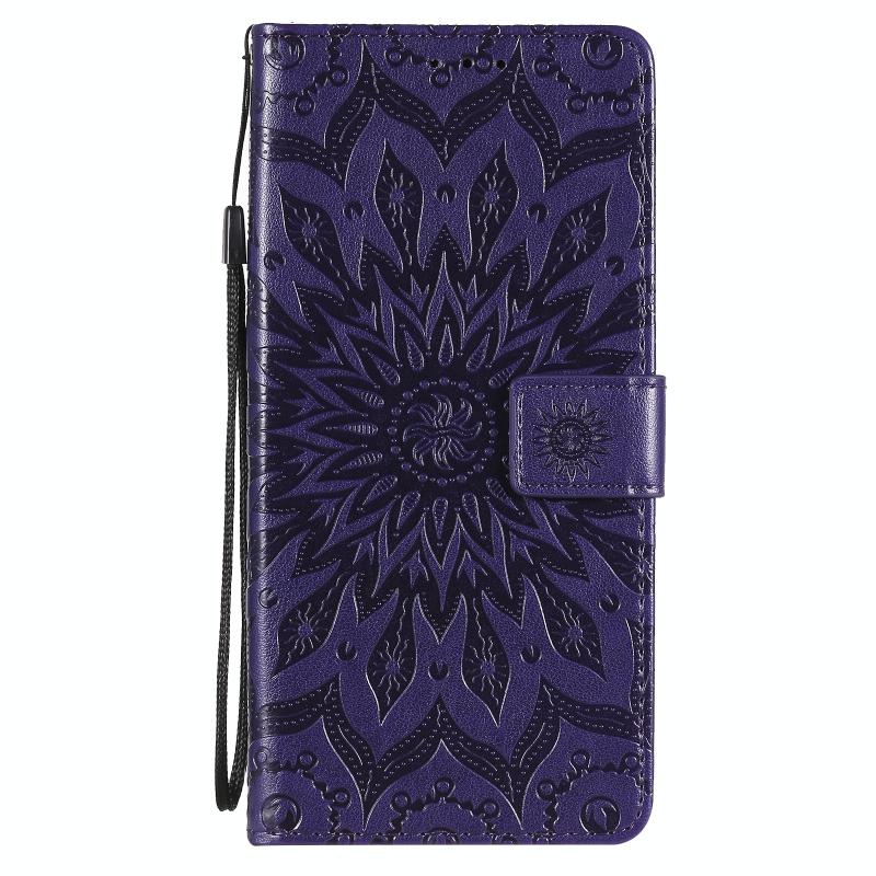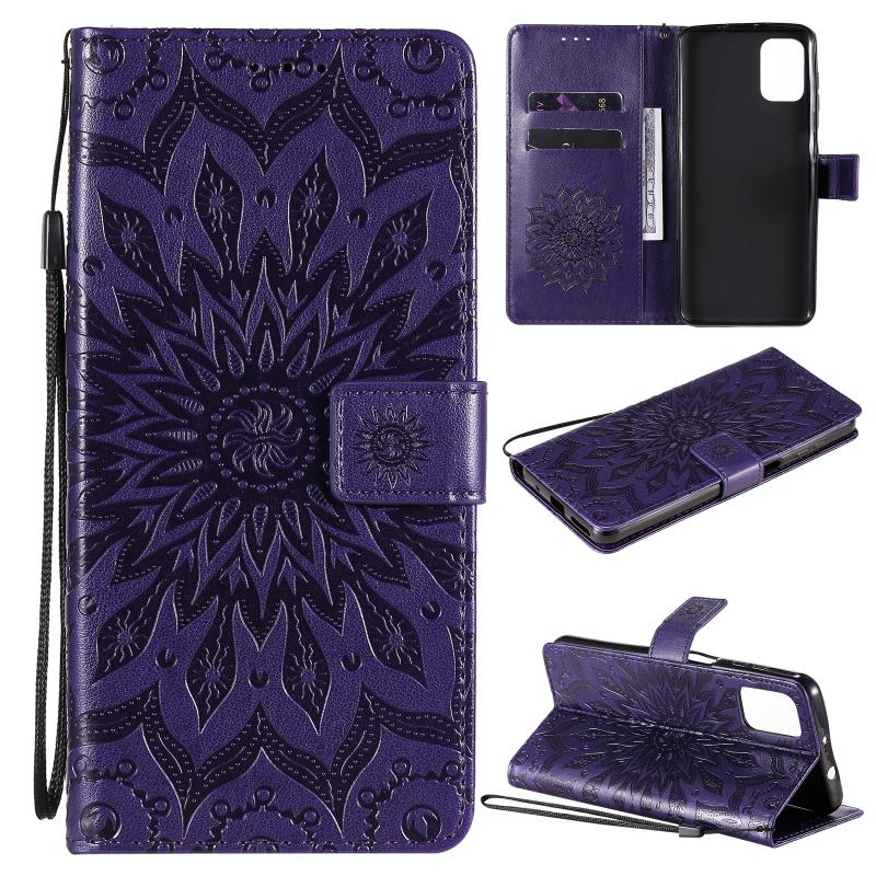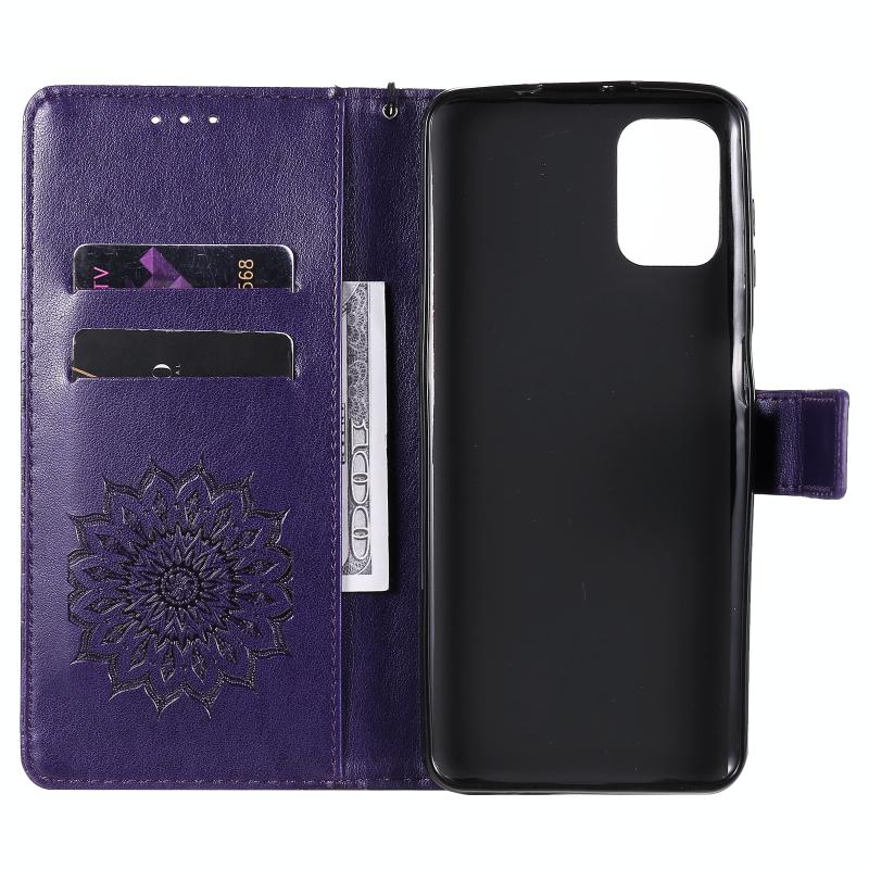 For Motorola Moto G9 Plus Pressed Printing Sunflower Pattern Horizontal Flip PU Leather Case with Holder & Card Slots & Wallet & Lanyard(Purple)