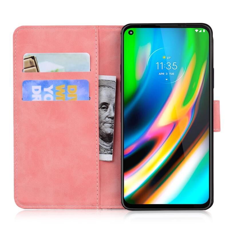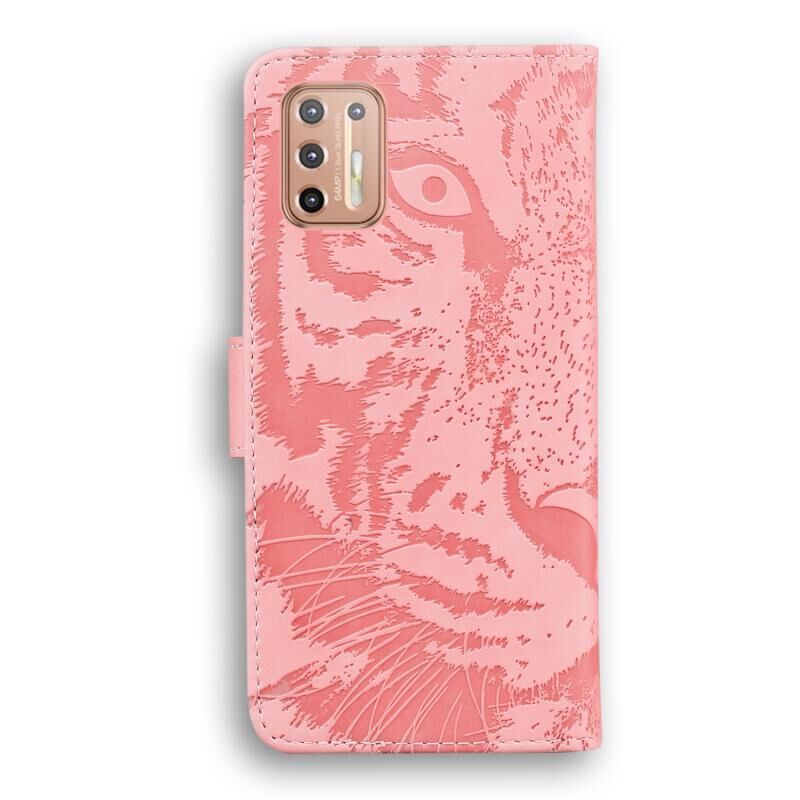 Θήκη δέρματος οριζόντιας αναδίπλωσης με ανάγλυφο μοτίβο τίγρης για Motorola Moto G9 Plus με βάση & υποδοχές καρτών & πορτοφόλι (ρόζ)