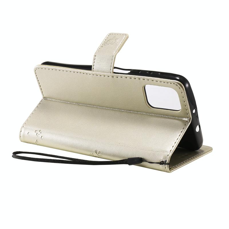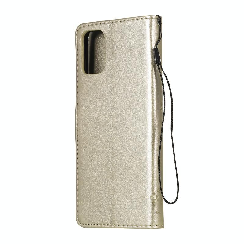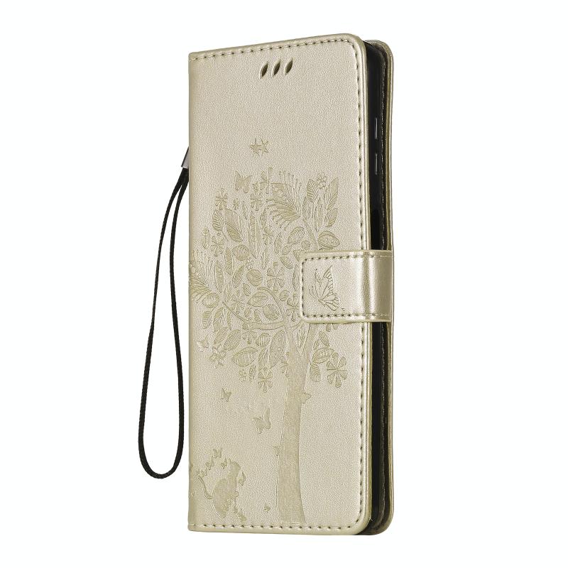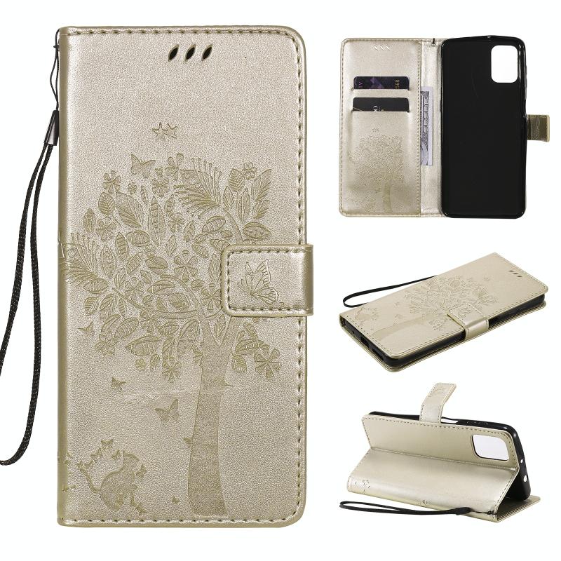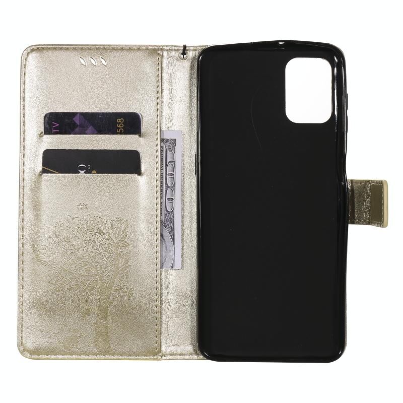 Θήκη για Motorola Moto G9 Plus με σχέδιο Δέντρου & Γάτας, εκτυπωμένη με θερμοτύπηση, οριζόντια, από δερματίνη PU με βάση στήριξης & θήκες για κάρτες & πορτοφόλι & κορδόνι (Χρυσό)