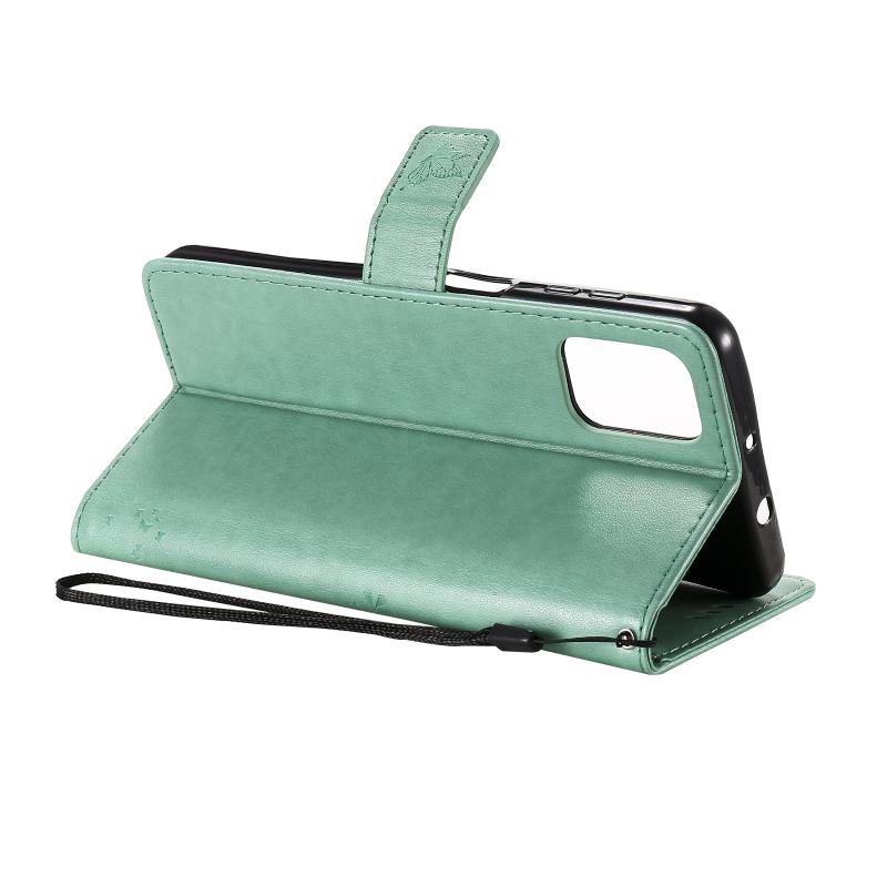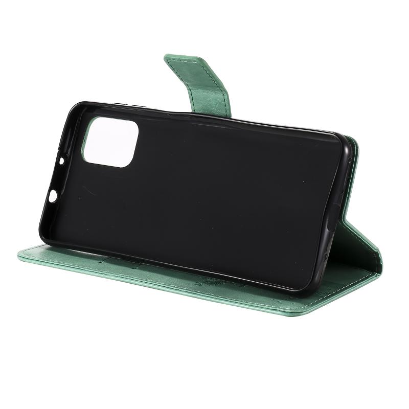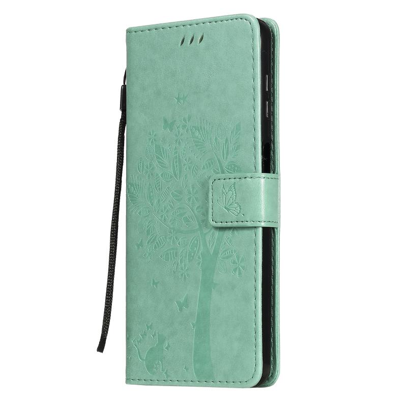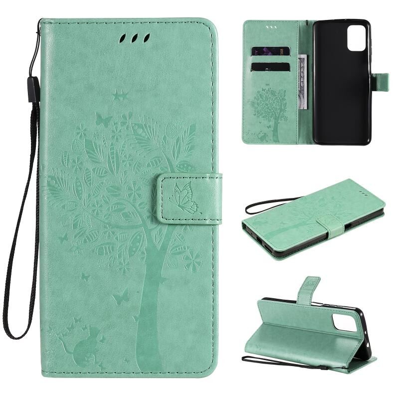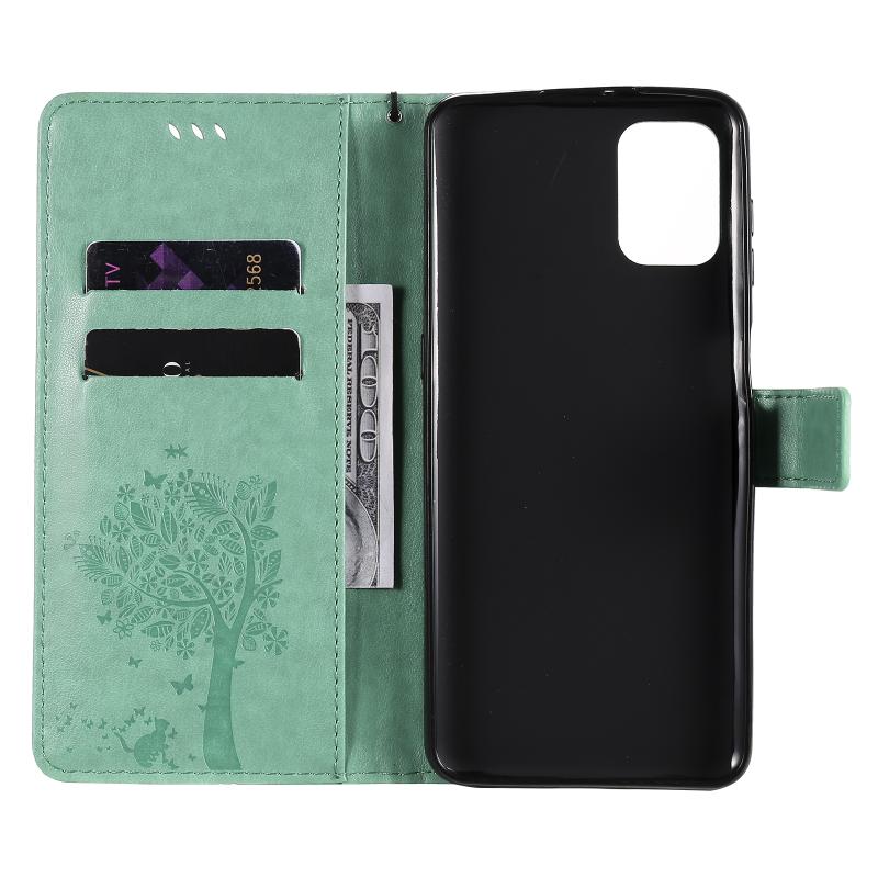 Θήκη για Motorola Moto G9 Plus με σχέδιο Δέντρου & Γάτας, εκτυπωμένη με θερμοτύπηση, οριζόντια, από δερματίνη PU με βάση στήριξης & θήκες για κάρτες & πορτοφόλι & κορδόνι (Χρυσό)