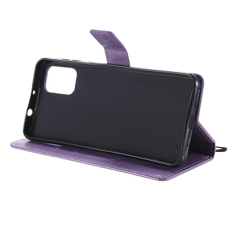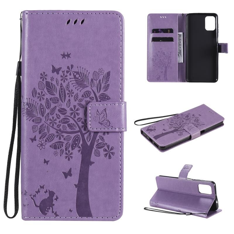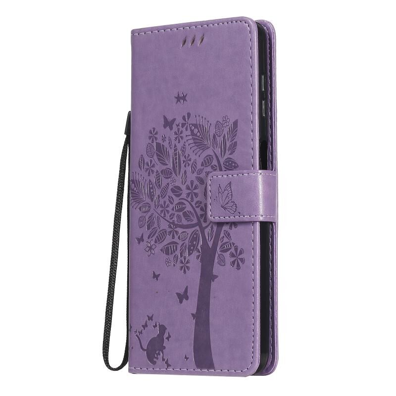 Θήκη για Motorola Moto G9 Plus με σχέδιο Δέντρου & Γάτας, εκτυπωμένη με θερμοτύπωση, οριζόντια, από δερματίνη PU με βάση στήριξης & θήκες για κάρτες & πορτοφόλι & κορδόνι (Ανοιχτό Μωβ)