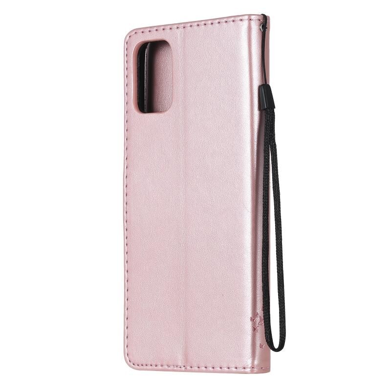 Θήκη για Motorola Moto G9 Plus με σχέδιο Δέντρου & Γάτας, εκτυπωμένη με θερμοτύπωση, οριζόντια, από δερματίνη PU με βάση στήριξης & θήκες για κάρτες & πορτοφόλι & κορδόνι (Ανοιχτό Μωβ)