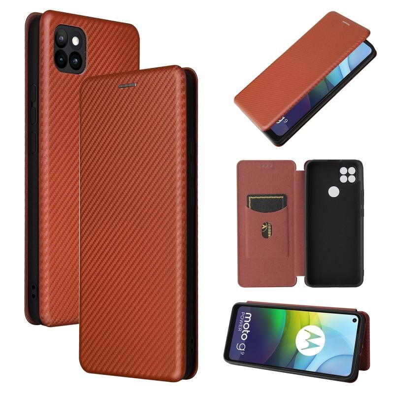 Θήκη για Motorola Moto G9 Power με υφή ανθρακονήματος, οριζόντια, αναδιπλούμενη από TPU + PC + Δερματίνη PU με θήκη για κάρτες (Μαύρο)