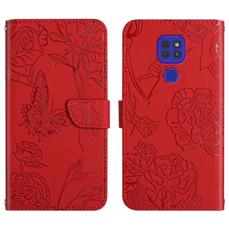 Θήκη κινητού τηλεφώνου από δέρμα με ανάγλυφο σχέδιο πεταλούδας και παιώνιας για Motorola Moto G9 (Κόκκινο)