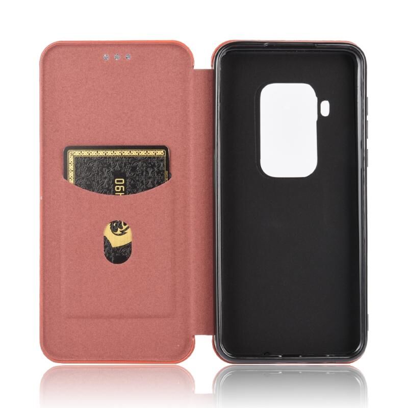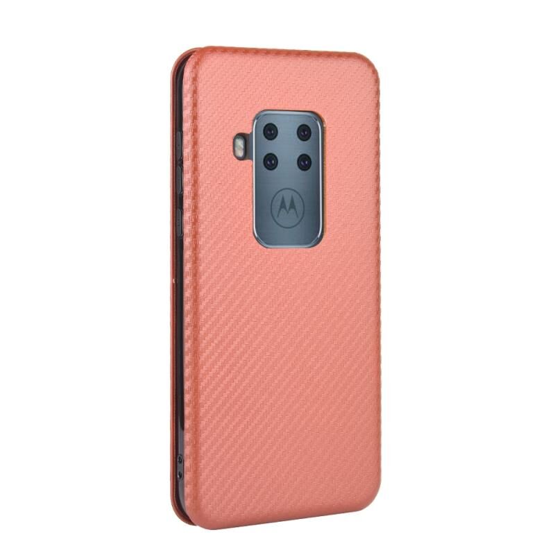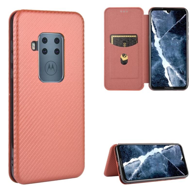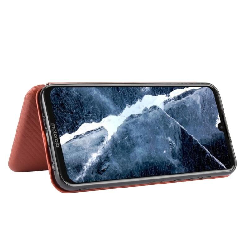 Θήκη για Motorola Moto One Zoom με υφή ανθρακονημάτων, οριζόντια, αναδιπλούμενη, από TPU + PC + Δερματίνη PU με κορδόνι & θήκη για κάρτες (Καφέ)