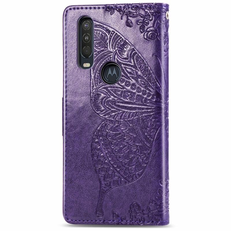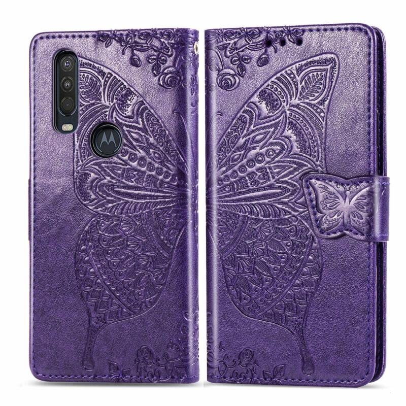 Θήκη δέρματος οριζόντιας αναδίπλωσης για Motorola One Action με ανάγλυφο σχέδιο πεταλούδας, λουλουδιών, με βάση στήριξης, κορδόνι και θήκη για κάρτες (Χρυσό ροζ)