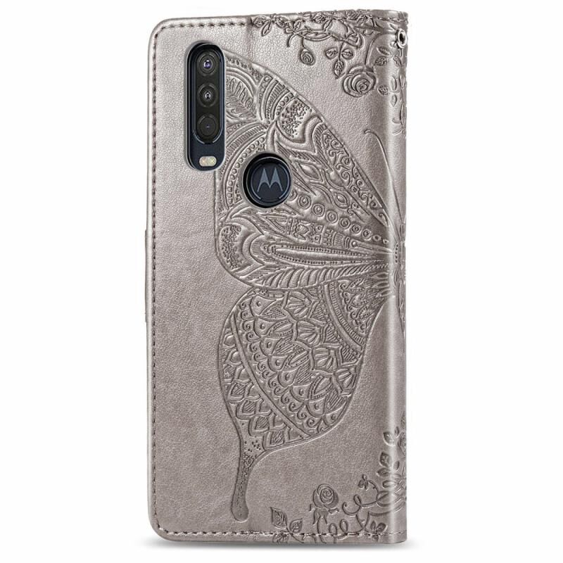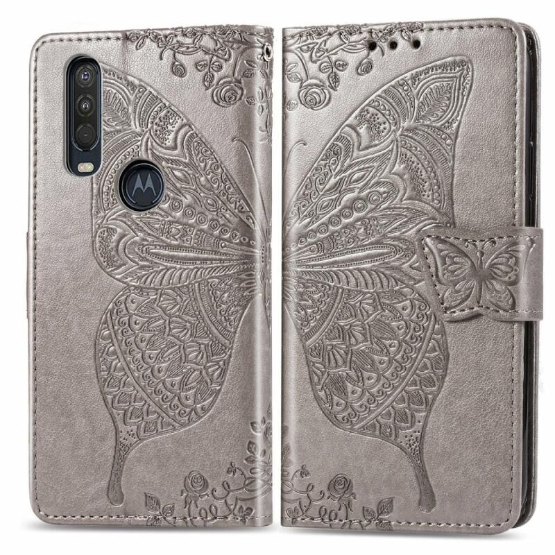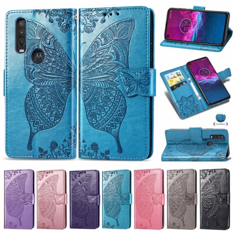 Θήκη δέρματος οριζόντιας αναδίπλωσης για Motorola One Action με ανάγλυφο σχέδιο πεταλούδας, λουλουδιών, στήριγμα, κορδόνι και θήκη για κάρτες/πορτοφόλι (Μπλε)
