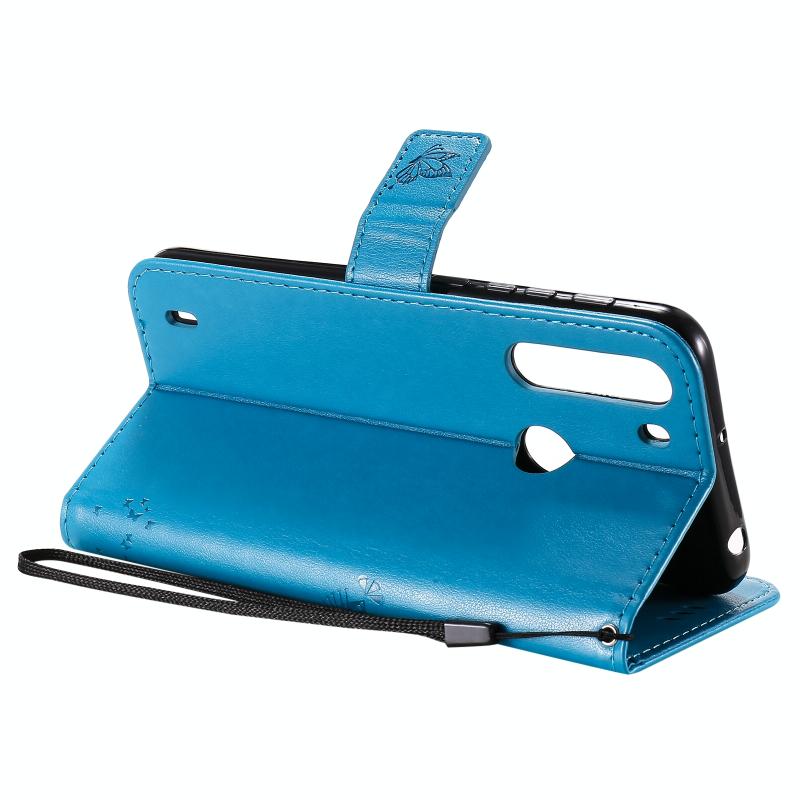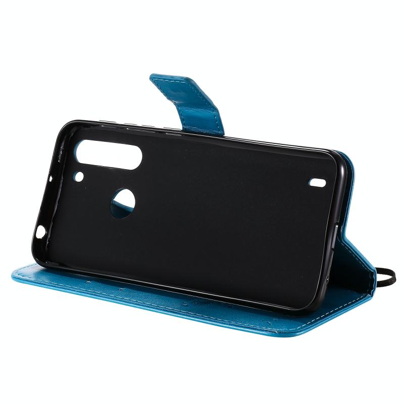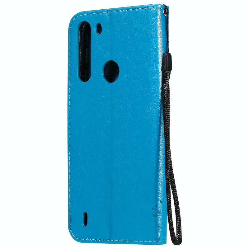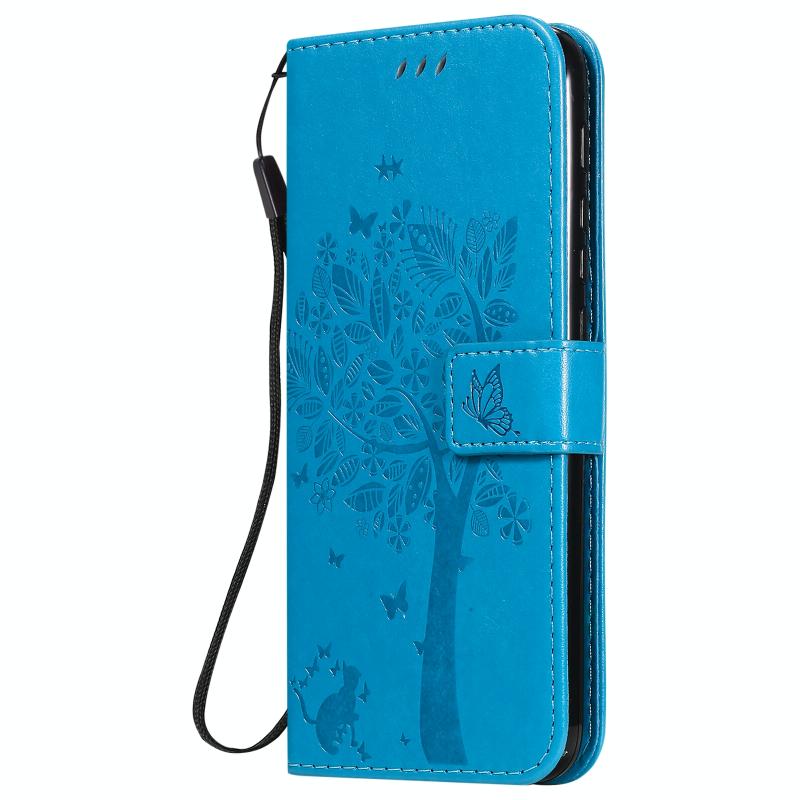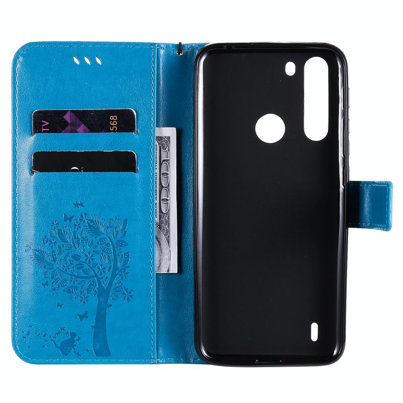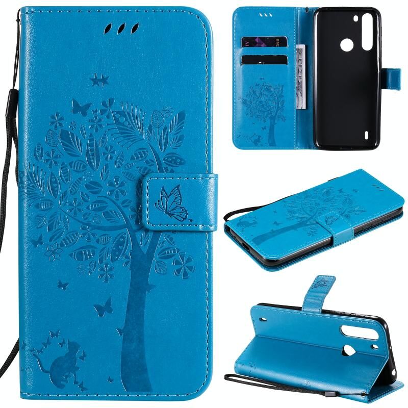 For Motorola One Fusion Tree & Cat Pattern Pressed Printing Horizontal Flip PU Leather Case with Holder & Card Slots & Wallet & Lanyard(Blue)