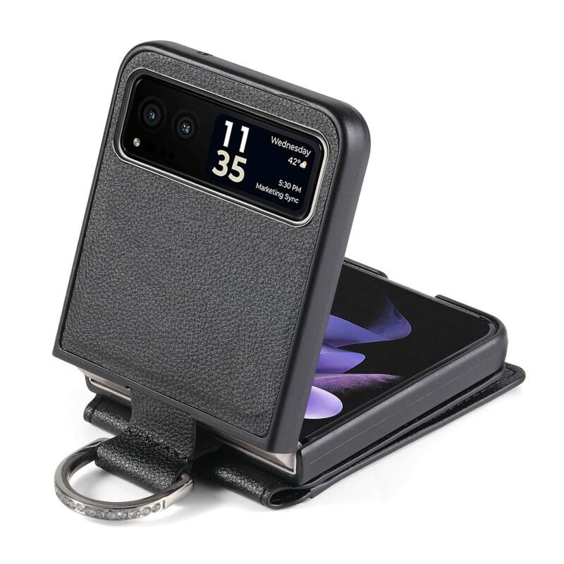 Θήκη τηλεφώνου Motorola Razr 40 με δερμάτινο πορτοφόλι με υφή Litchi και δακτύλιο (Μαύρο)